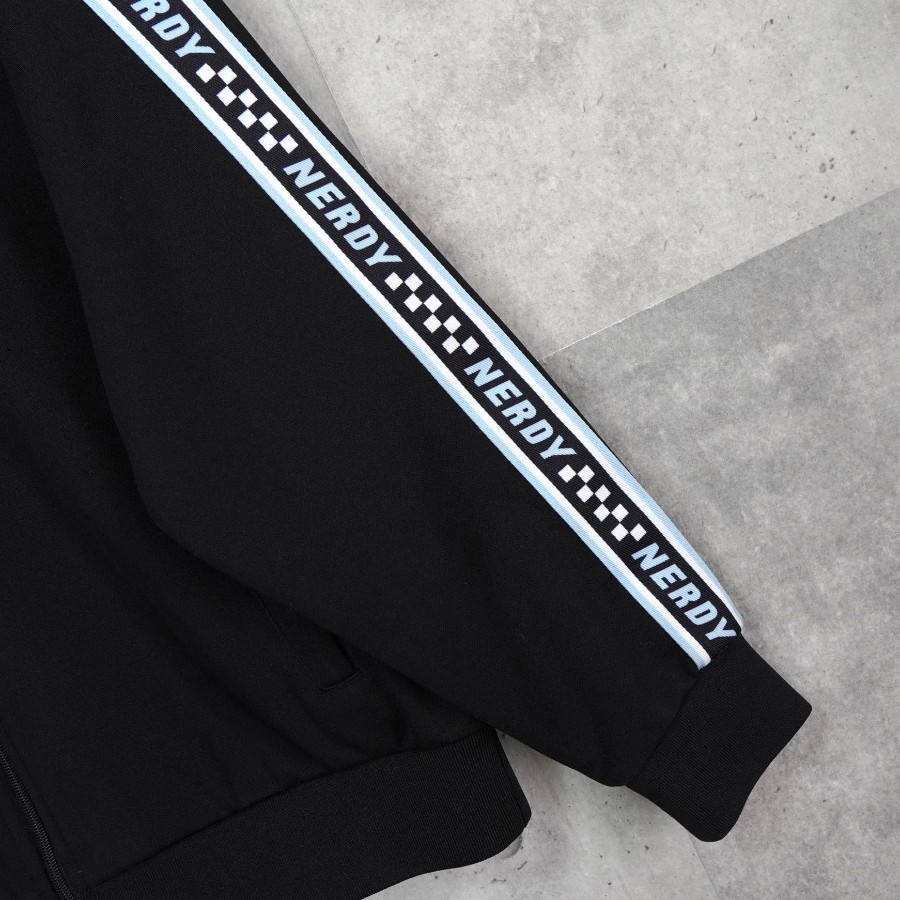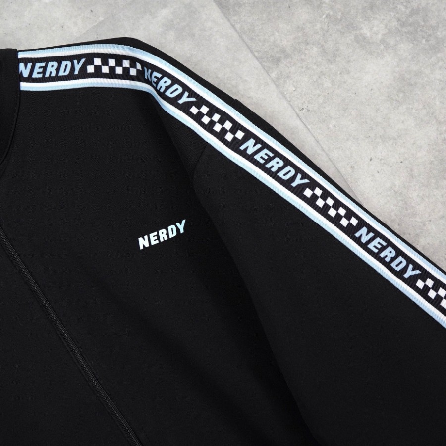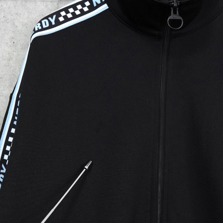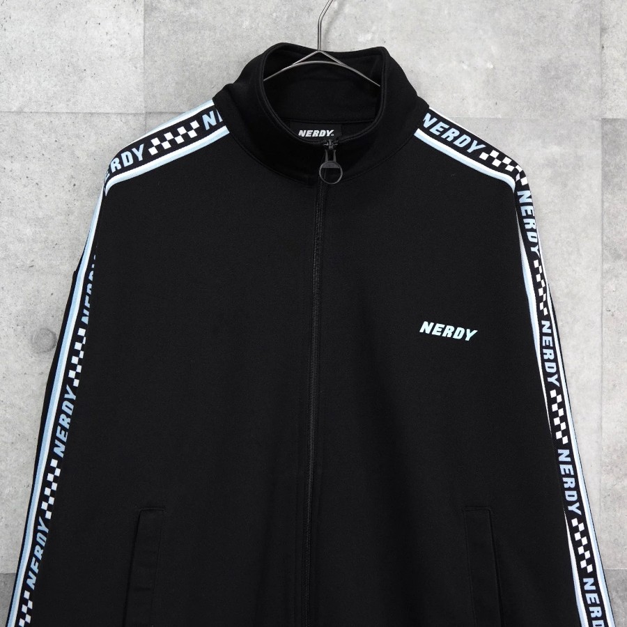 ノルディ ロゴ ショート丈 トラックジャケット ブラック | Brand: NERDY | Category: Jacket / Outerwear | Color: Black | Material: ポリエステル100% | Condition: Good | Condition Notes: フロントに薄汚れ、背面袖部分にいくつかの小さな穴がみられます。(タグより後の写真参照) | Size: 表記サイズ:S 目安サイズ:メンズM / レディースL 程度 ※あくまで目安ですので参考程度でお考えください 肩幅:約61cm 身幅:約59cm 着丈:約62.5cm 袖丈:約52.5cm