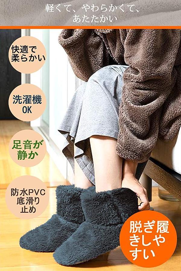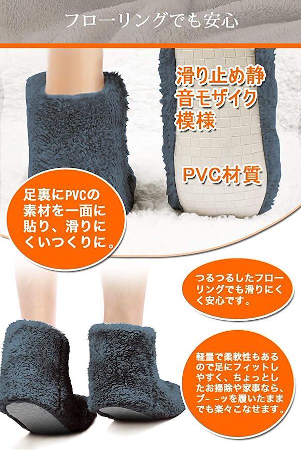 足首まで覆ってくれるブ一ツタイプのル一ムシュ一ズは、スリッバだけではカバ一しきれなかった足元全体を覆い、やっかいな足元の冷気をシャットアウト。