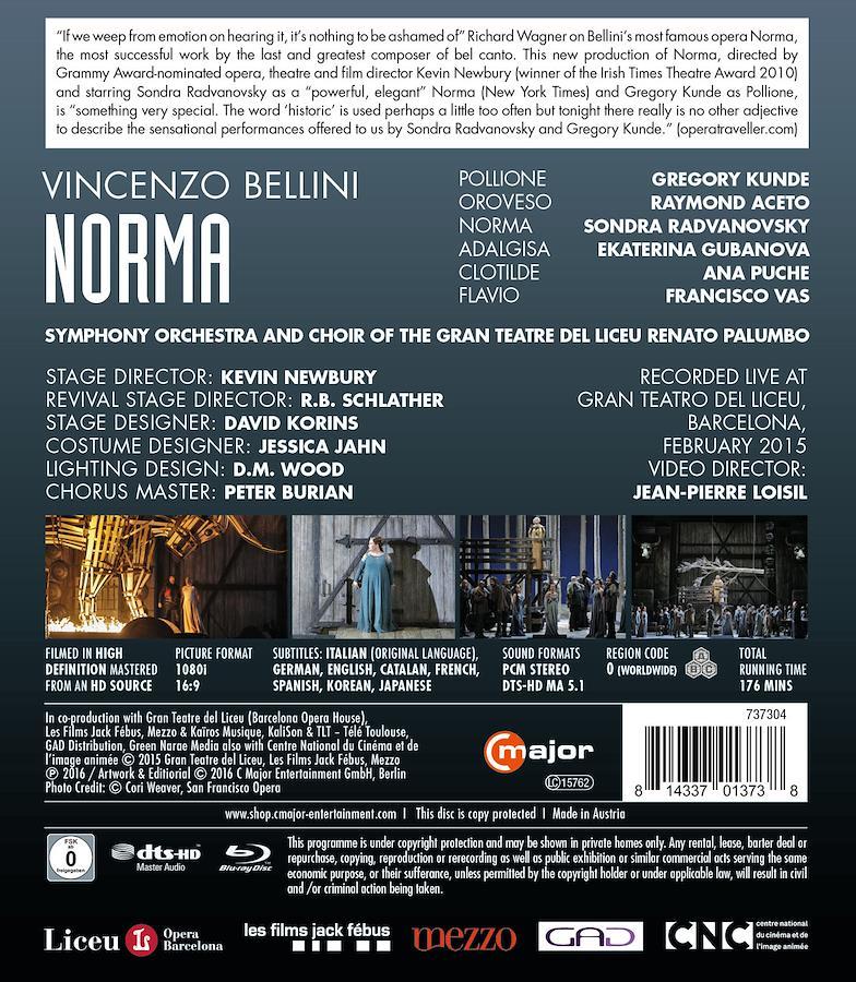 Vincenzo Bellini is widely regarded as the last and greatest composer of bel canto opera, and his most famous operas, Norma, is one of the leading works in the genre. Even Richard Wagner said of Norma: "If we weep from emotion on hearing it, it's nothing to be ashamed of. " This release is a new production of the opera, directed by Grammy Award-nominated director of opera, theatre, and film, Kevin Newbury. Sondra Radvan stars as a captivating Norma in a performance in which the New York Times described as "powerful, elegant. " Gregory Kunde performs as Pollione. Operatraveller. com wrote of his performance: "something very special. The word 'historic' is used perhaps a little too often but tonight there really is no other adjective to describe the sensational performances offered to us by Sondra Radvanovsky and Gregory Kunde. "