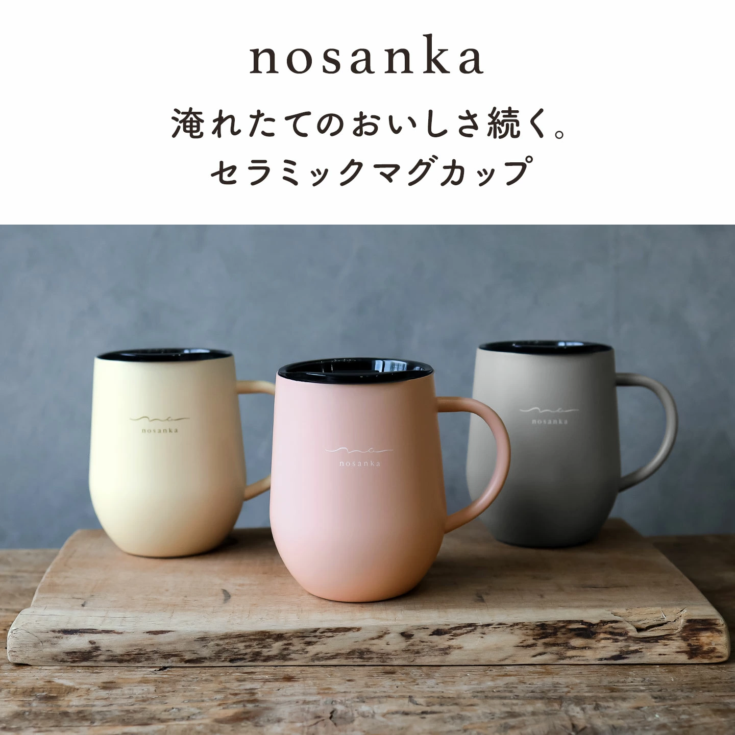 【NEW STANDARD MUG round type / ニュースタンダード マグ ラウンドタイプ】香りに敏感で、ステンレスのにおいが苦手、スローペースで飲まれる方におすすめのマグカップ。「nosanka」は内側にセラミック加工構造なのでステンレス特有の金属臭はありません。長時間コーヒーなどの飲み物を入れておいても金属特有のニオイがつく心配がなく、コーヒー本来の香りや風味をお楽しみいただけます。また、スポーツドリンクやスープ、炭酸飲料にもご使用いただけます。光を遮断し酸化を遅らせる、スモークがかった半透明の蓋付き。スライド式の飲み口で、片手でも開閉がスムーズです。さらに、飲み口部分にはストローを挿してお使いいただくこともできます。