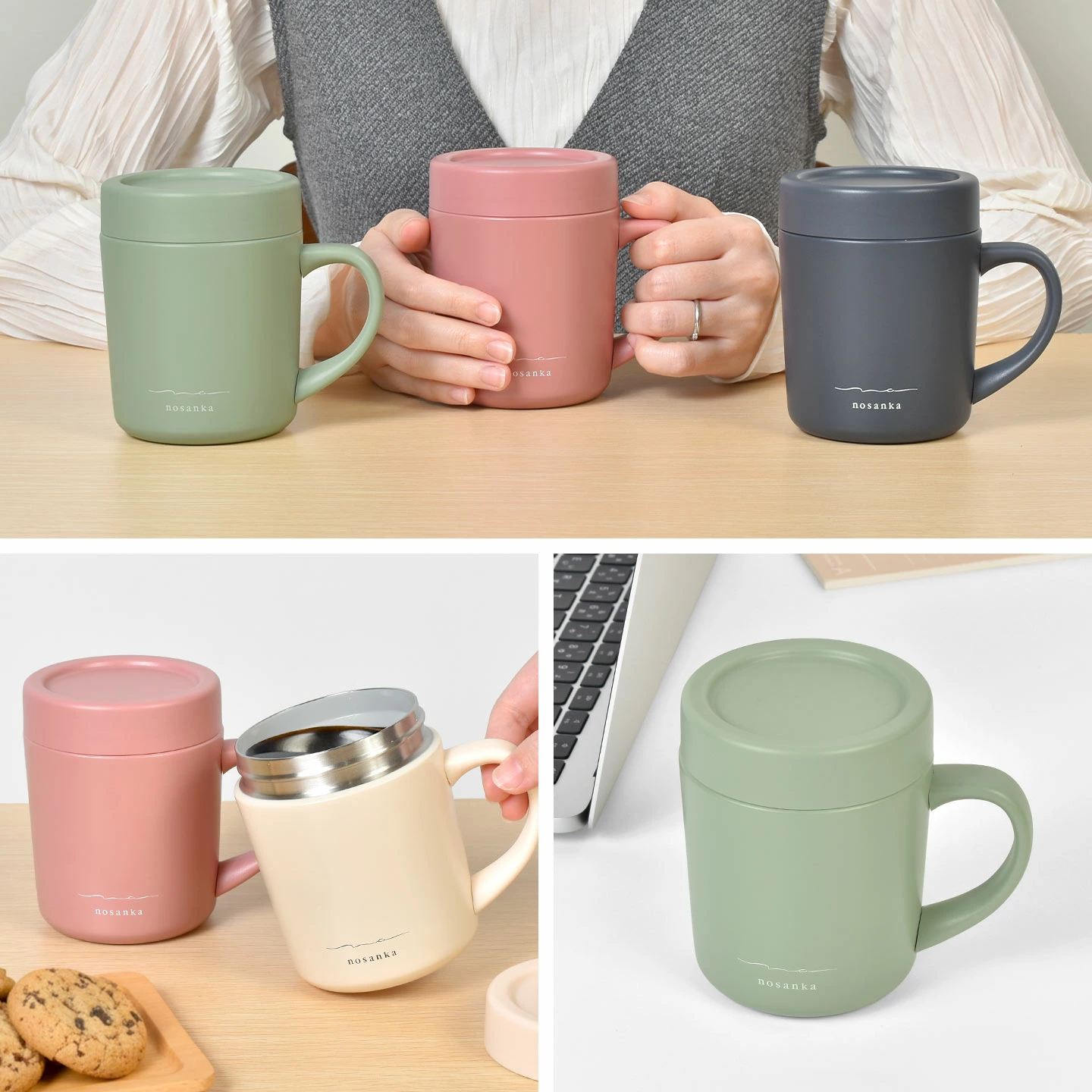 【NEW STANDARD CERAMIC MUG WITH LID / ニュースタンダード セラミック マグ】香りに敏感で、ステンレスのにおいが苦手、スローペースで飲まれる方におすすめのマグカップ。「nosanka」は内側にセラミック加工構造なのでステンレス特有の金属臭はありません。長時間コーヒーなどの飲み物を入れておいても金属特有のニオイがつく心配がなく、コーヒー本来の香りや風味をお楽しみいただけます。また、スポーツドリンクやスープ、炭酸飲料にもご使用いただけます。白湯やお薬用のお水などのちょい飲み用にも便利です。本体はスタンダードな形ですが、完全密封することができるのでちょっとした持ち運びはもちろん、埃対策にも◎