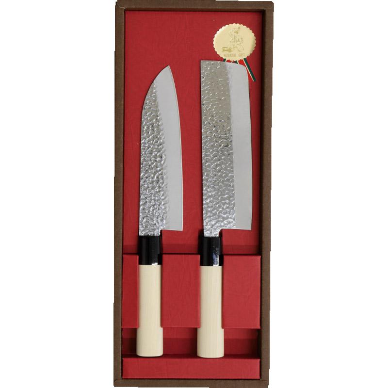 〇商品仕様●内容:三徳包丁:刃渡り170mm・菜切包丁:刃渡り170mm×各1規格●化粧箱入(175×40×400mm) 350g●材質:ステンレス刃物鋼、天然木●加工地:日本