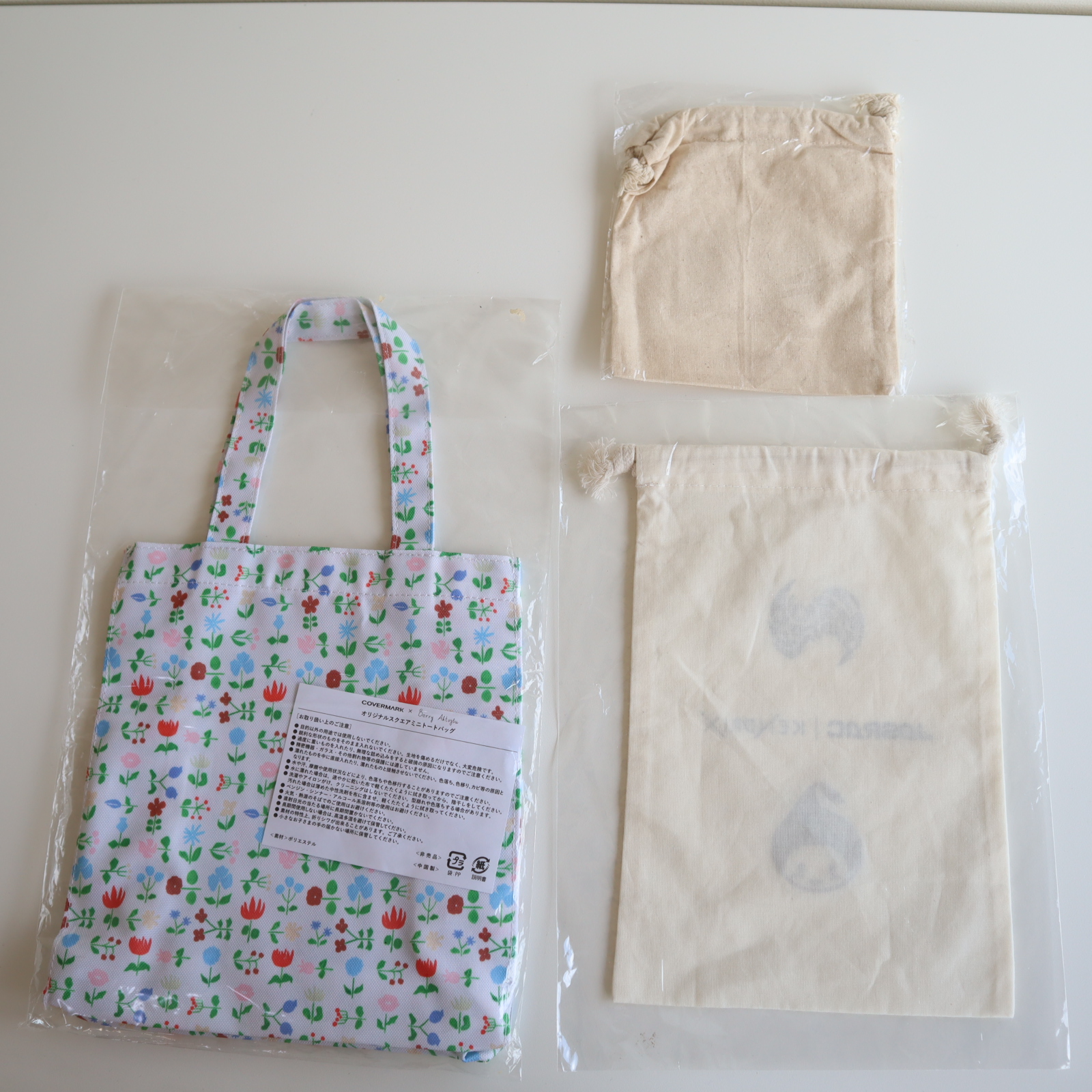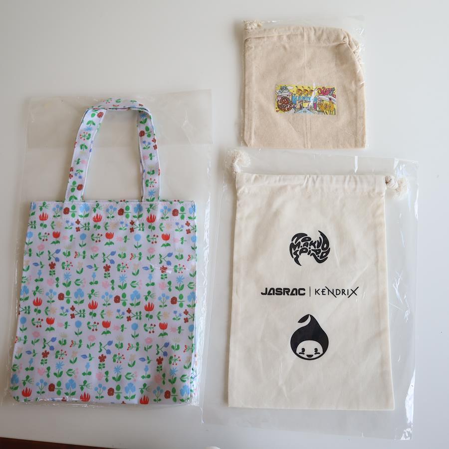 【セット内容】・COVERMARK × Berry Aktuglu オリジナルスクエアミニトートバッグ(未使用・袋入り)・コットン巾着袋(イラスト入り/未使用)・JASRAC × KENDRIX コラボ巾着袋(未使用・袋入り)