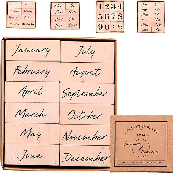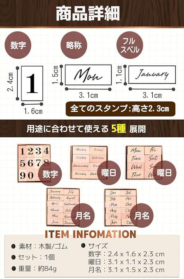 「商品詳細」素材:木製/ゴムセット:1個/重量:約84g/サイズ:数字:2.4 x 1.6 x 2.3 cm/曜日:3.1 x 1.1 x 2.3 cm/月名:3.1 x 1.5 x 2.3 cm/