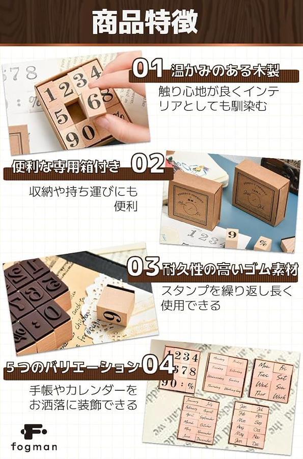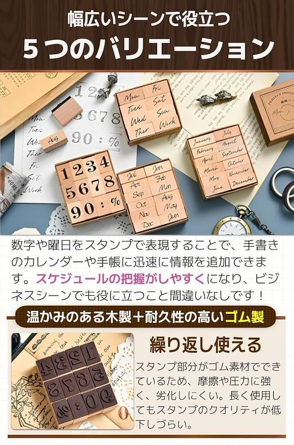 「商品特徴」(1)温かみのある木製:触り心地が良くインテリアとしても馴染む/(2)便利な専用箱付き:収納や持ち運びにも便利/(3)耐久性の高いゴム素材:スタンプを繰り返し長く使用できる/(4)5つのバリエーション:手帳やカレンダーをお洒落に装飾できる