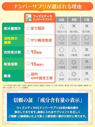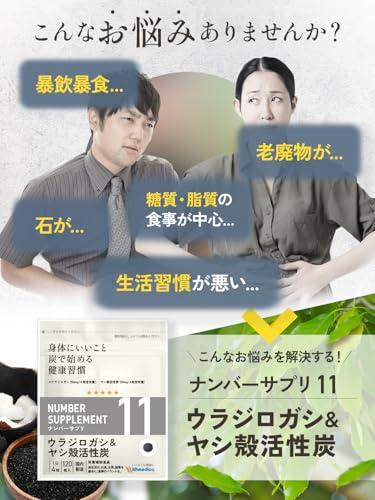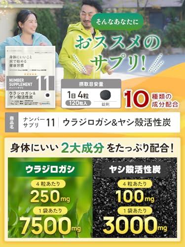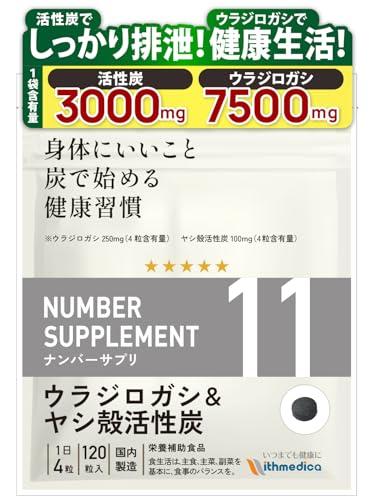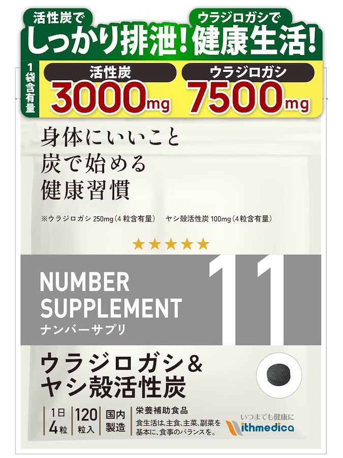 ?【ウラジロガシ、活性炭で体をキレイに!】【ウラジロガシ4粒で250mg、ヤシ殻活性炭100mgの高配合!!】「ナンバーサプリ11 ウラジロガシ&ヤシ殻活性炭」は、10種類の成分を配合しています。配合成分はウラジロガシ、ヤシ殻活性炭、キトサン、田七人参、アルギン酸ナトリウム、クマザサ、ハトムギ、未焼成カルシウム、葉酸、ビタミンB6となります。 配合しているウラジロガシ250mg、ヤシ殻活性炭100mg(4粒あたり)は業界トップクラスの高配合量になります。ウィズメディカのサプリメントは国産品質、GMP工場製造で、香料・着色料・保存料を使用せずに製造しています。(1袋120粒入り/1日4粒目安) ?【ウィズメディカ独自の配合成分】ウラジロガシ、ヤシ殻活性炭だけではなくウィズメディカ独自の追加栄養補助成分としてキトサン、田七人参、アルギン酸ナトリウム、クマザサ、ハトムギ、未焼成カルシウム、葉酸、ビタミンB6も配合しています。 ?【全成分配合量を明記】ナンバーサプリは全成分配合量を開示しております。身体に入れるサプリメントを正しくご理解・ご納得頂いた上で長くご愛用頂く事が大切だと考えます。[ナンバーサプリ11 ウラジロガシ&ヤシ殻活性炭/4粒あたりの配合量]ウラジロガシ・・・250.0mg/ヤシ殻活性炭・・・100.0mg/キトサン・・・100.0mg/ 田七人参・・・10.0mg/アルギン酸ナトリウム・・・10.0mg/クマザサ・・・5.04mg/ハトムギ・・・5.04mg/未焼成カルシウム・・・38mg/葉酸・・・240?/ビタミンB6・・・1.32mg ?【日本国内で製造】徹底的に管理された日本国内のGMP工場で製造しています。香料、保存料、着色料は一切使用していません。 ?【商品区分】ナンバーサプリ11 活性炭 サプリ 活性炭サプリ ウラジロガシ ウラジロガシサプリ チャコール サプリメント チャコールクレンズ 無添加 国産 食用炭 ヤシ殻活性炭 キトサン 田七人参 アルギン酸ナトリウム クマザサ ハトムギ 未焼成カルシウム 葉酸 ビタミンB6 サプリメント 炭サプリ タブレット 健康食品 炭 置き換え