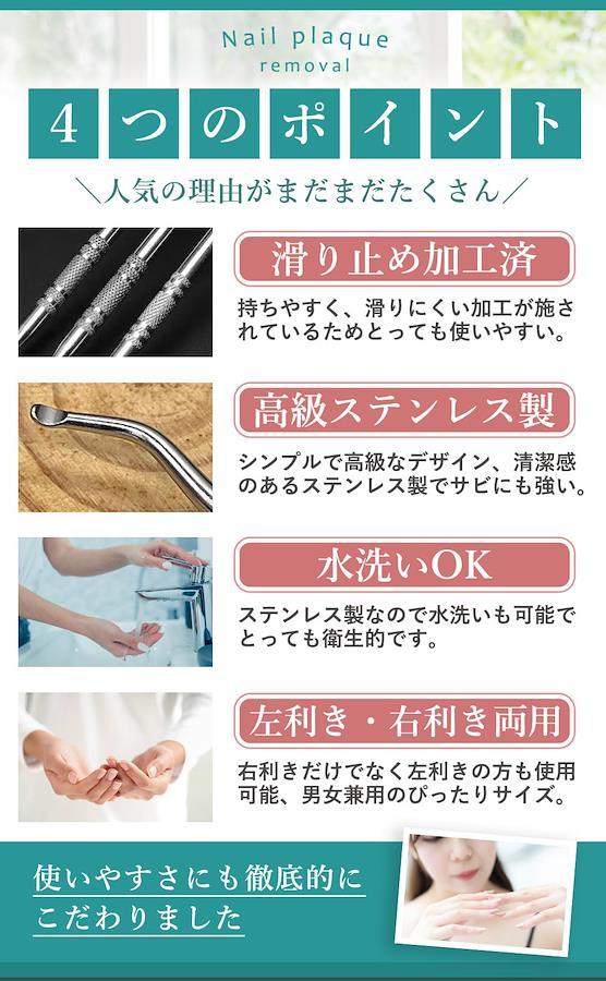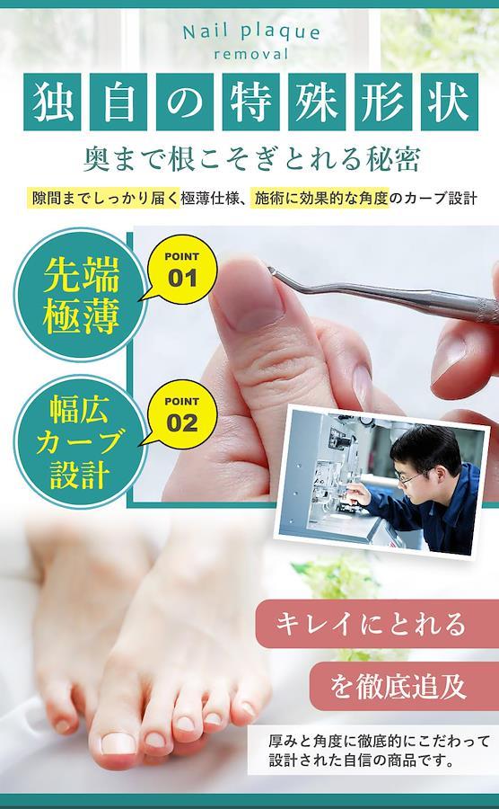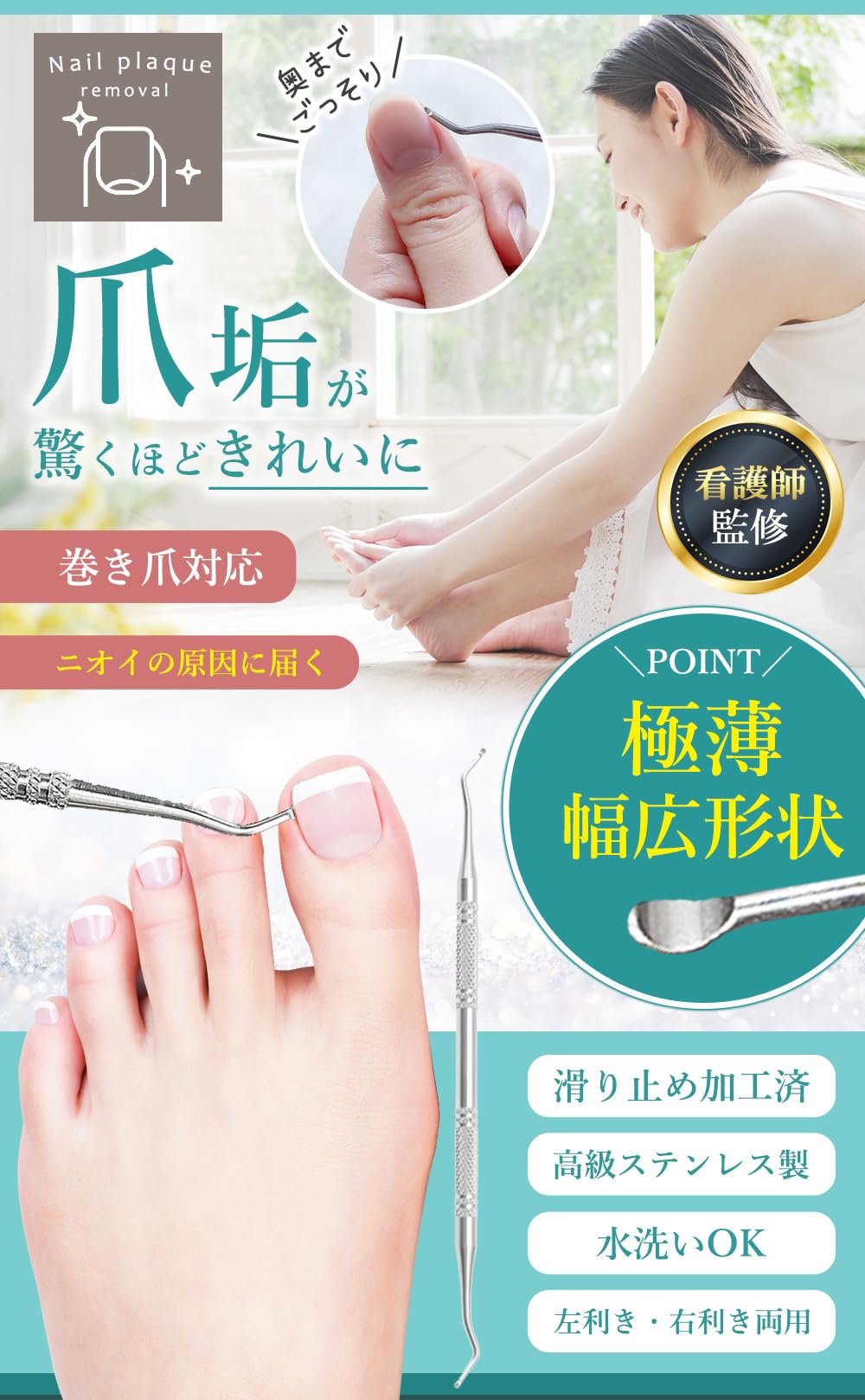 【使い方・使用上の注意】手はもちろん足の角質は特に固くお風呂上がりの使用を推奨しております。①スプーン部分をゆっくり爪の隙間に挿入②溜まった垢や汚れをやさしく掻きだしてください。※スプーンを激しく挿入すると皮膚を傷つける恐れがありますのでご注意ください。 ?現役看護師と共同開発したYamozzu爪垢取りは取りやすさ厚さを追求して簡単に取れる形状です。 ?日常的に靴を履いているため、爪垢は湿度が高い環境にあり放っておくとさらに真菌が増殖して爪のトラブルやカビの原因になります。 ?独自のカーブ設計、先端極薄なので爪のトラブル、匂いの根源を綺麗に取り除くことができます。 ?アレルギーに優しい高級ステンレス製を起用しています。滑り止め加工も施されていて水洗いOKで衛生的、清潔に保てます。 ?安心の1年間保証なので万が一商品に不良がある場合は交換・返品に対応させていただきます