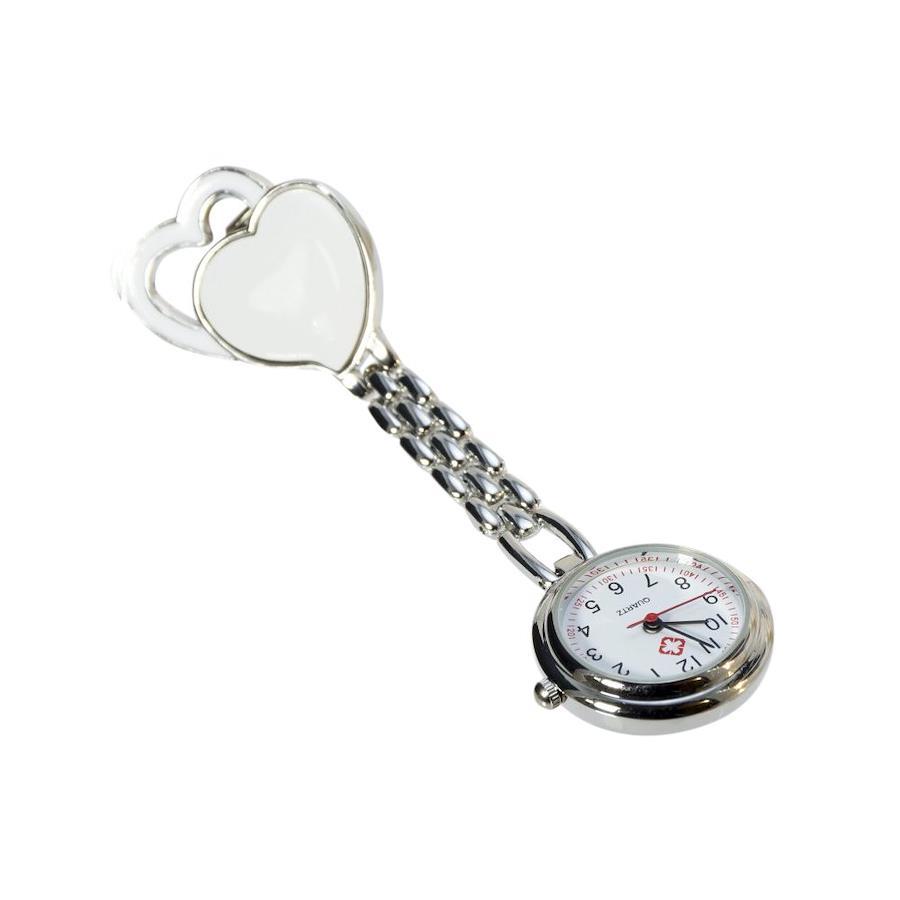 かわいいハート柄のナースウォッチです。カラーはピンクとホワイトの2色からお選びいただけます。クリップで留めたときに見やすい逆さ文字盤です。クリップ式