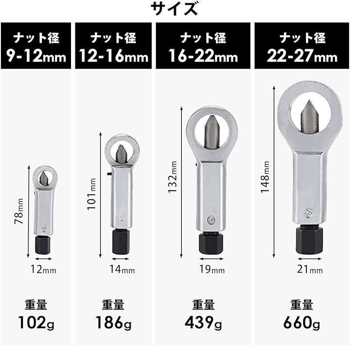 「4サイズ対応で多用途に活躍」 9mm-12mm、12mm-16mm、16mm-22mm、22mm-27mmの4種類のサイズがセットになっており、幅広いナット径に対応します。