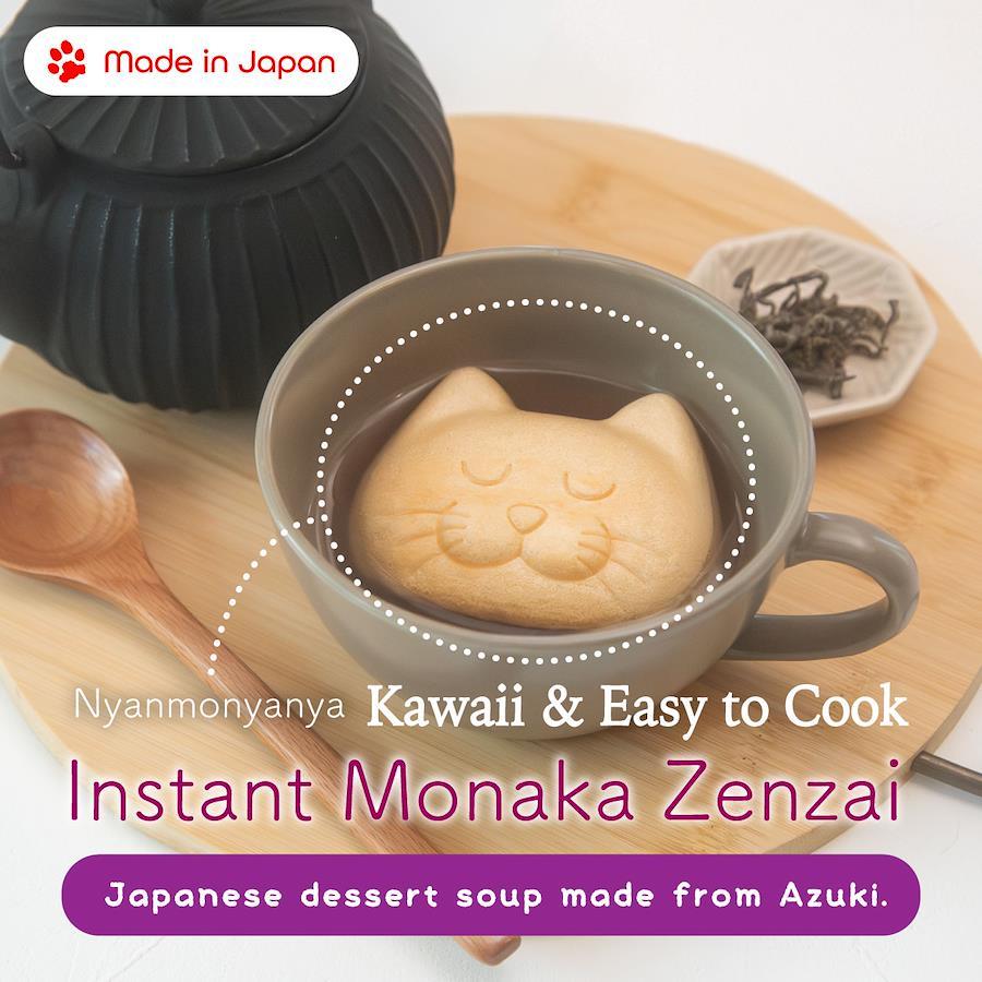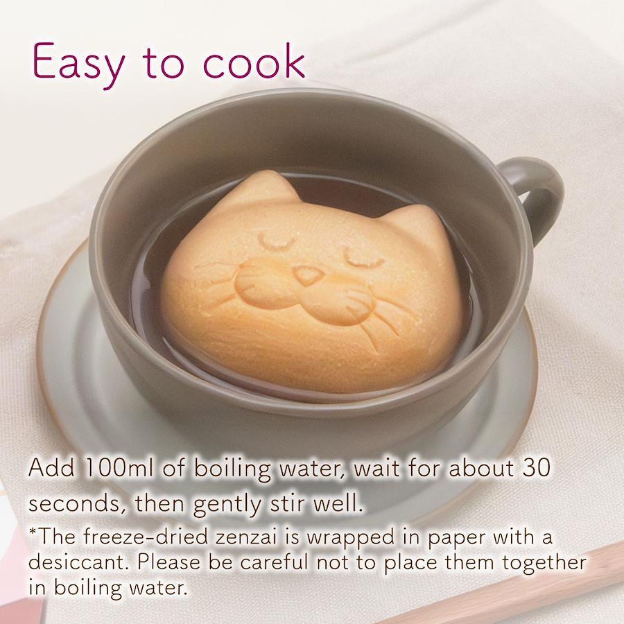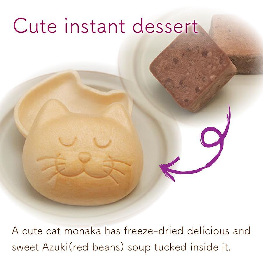 ぷっくりとしたウィスカーパッド(ひげ袋)がチャームポイントの『NYAN MO NYA NYA』に、フリーズドライのおぜんざいを閉じ込めました。北海道産の小豆を澄んだ水でじっくりと丁寧に炊き上げたこだわりのあんこで作ったぜんざいに、香ばしいもなかを加えてお湯を注ぐだけで手軽に風味豊かな本格的なぜんざいがお楽しみいただけます。