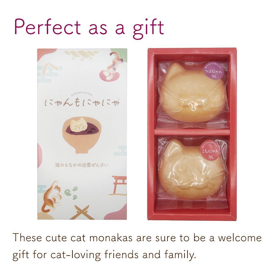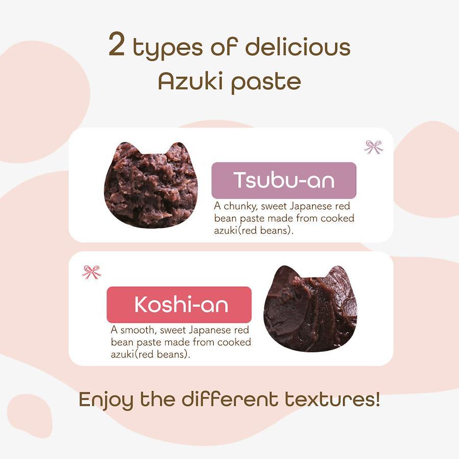 小豆本来の味を活かし上品な甘さに仕上げたぜんざいは、つぶあん(Tsubu NYAN)とこしあん(Koshi NYAN)の2種類が楽しめます。 もなかはぜんざいにたっぷり浸してもちもちの食感を、あとのせでパリパリ感を、お好みに合わせてお楽しみいただけます。