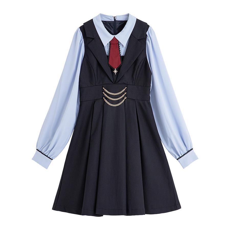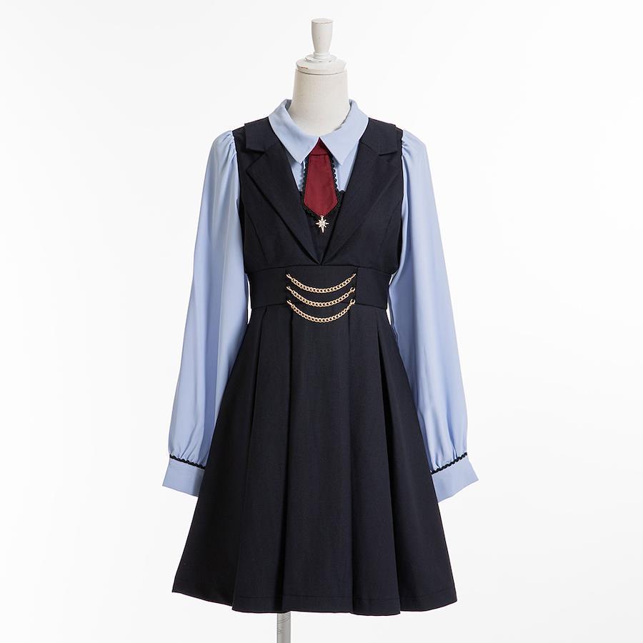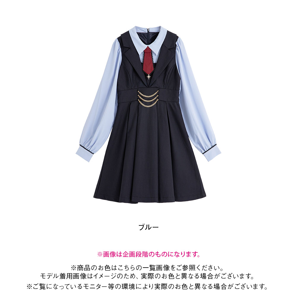 【デザイン】小悪魔風なアクアのスーツデザインからインスパイアを受けた、ジャケット風ワンピース。アクアのイメージカラーであるブルーをブラウス部分に使用し、ブラックのジャケット風でかっちり感のあるデザインに仕上げました。ボルドーのネクタイはアジャスター付きで、ご自身で調節していただけます。ネクタイの先には瞳を表したキラキラチャームが◎