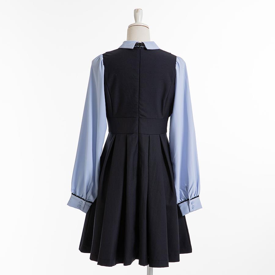 【素材】本体生地は程よくハリのある素材を使用。身頃とスカート部分には裏地がついています。ジャケット風のドッキングデザインなので、後ろのファスナーで着脱していただく仕様です。