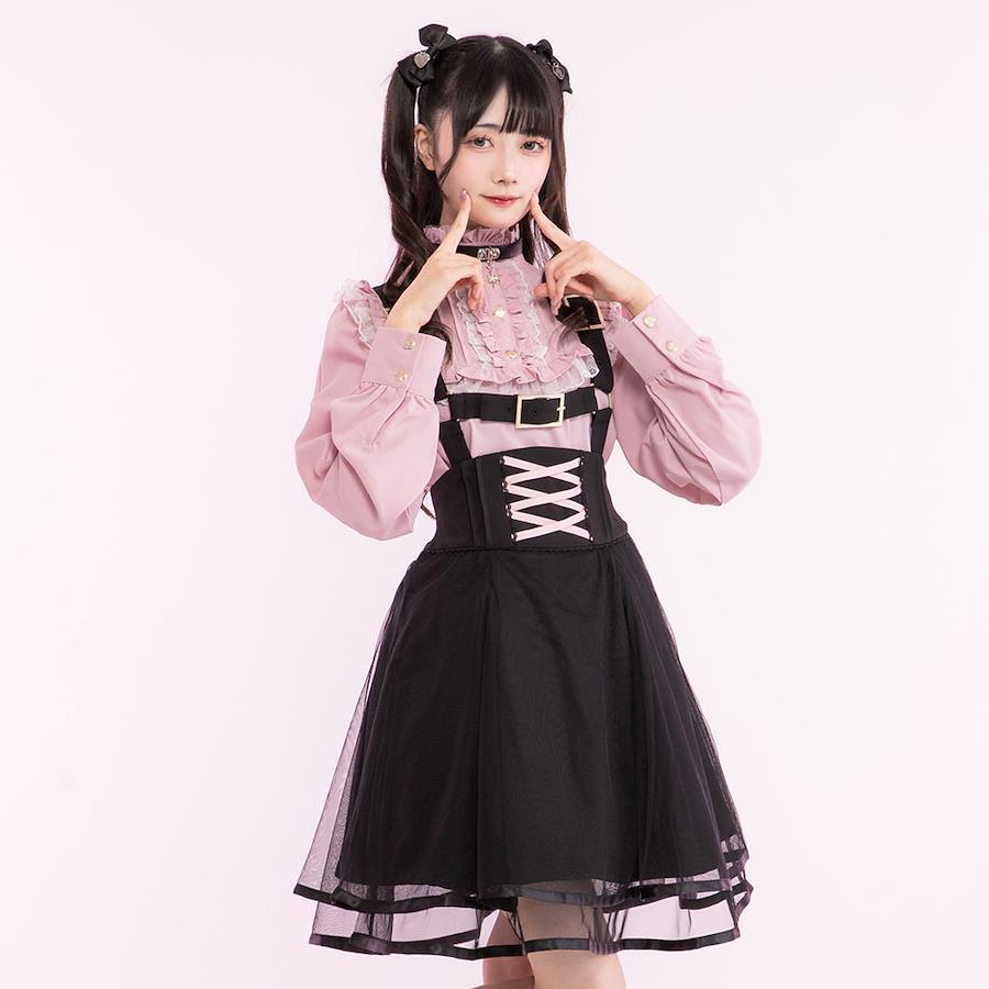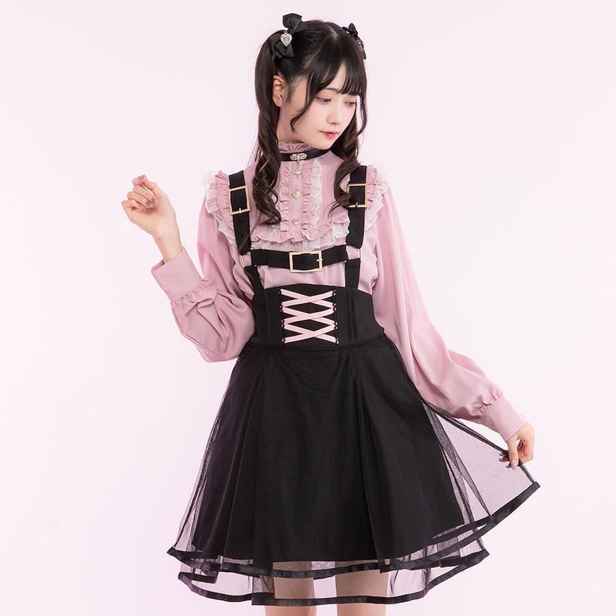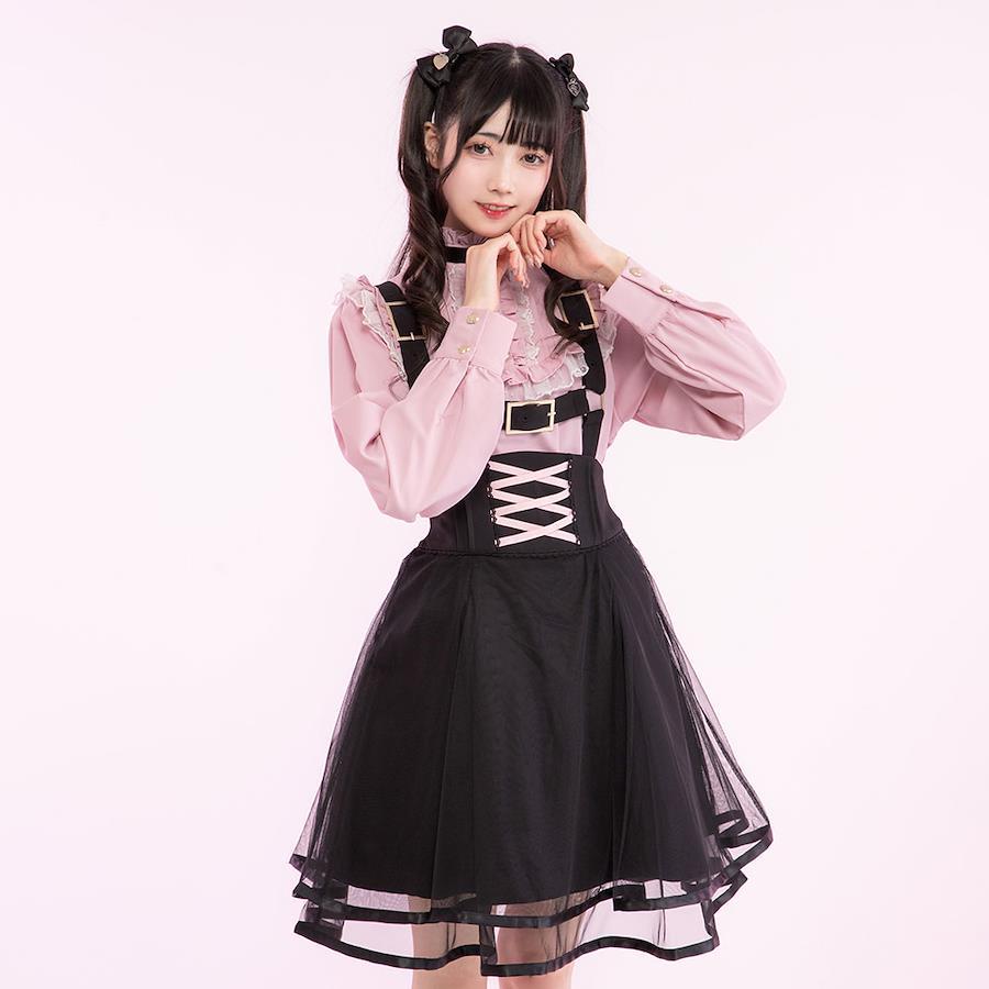 【デザイン】ルビーのかわいらしさからインスパイアを受けた、フリルとレースがたっぷりのピンクブラウス。セットのチョーカーで小悪魔さもアップします◎セットのチョーカーには瞳を表したキラキラチャームが…!スカートはちょっぴりハードめなベルトをたくさん付け、可愛さだけじゃない内面が表現されたデザインです。スカートはゴム無しで綺麗なシルエットにこだわりました。