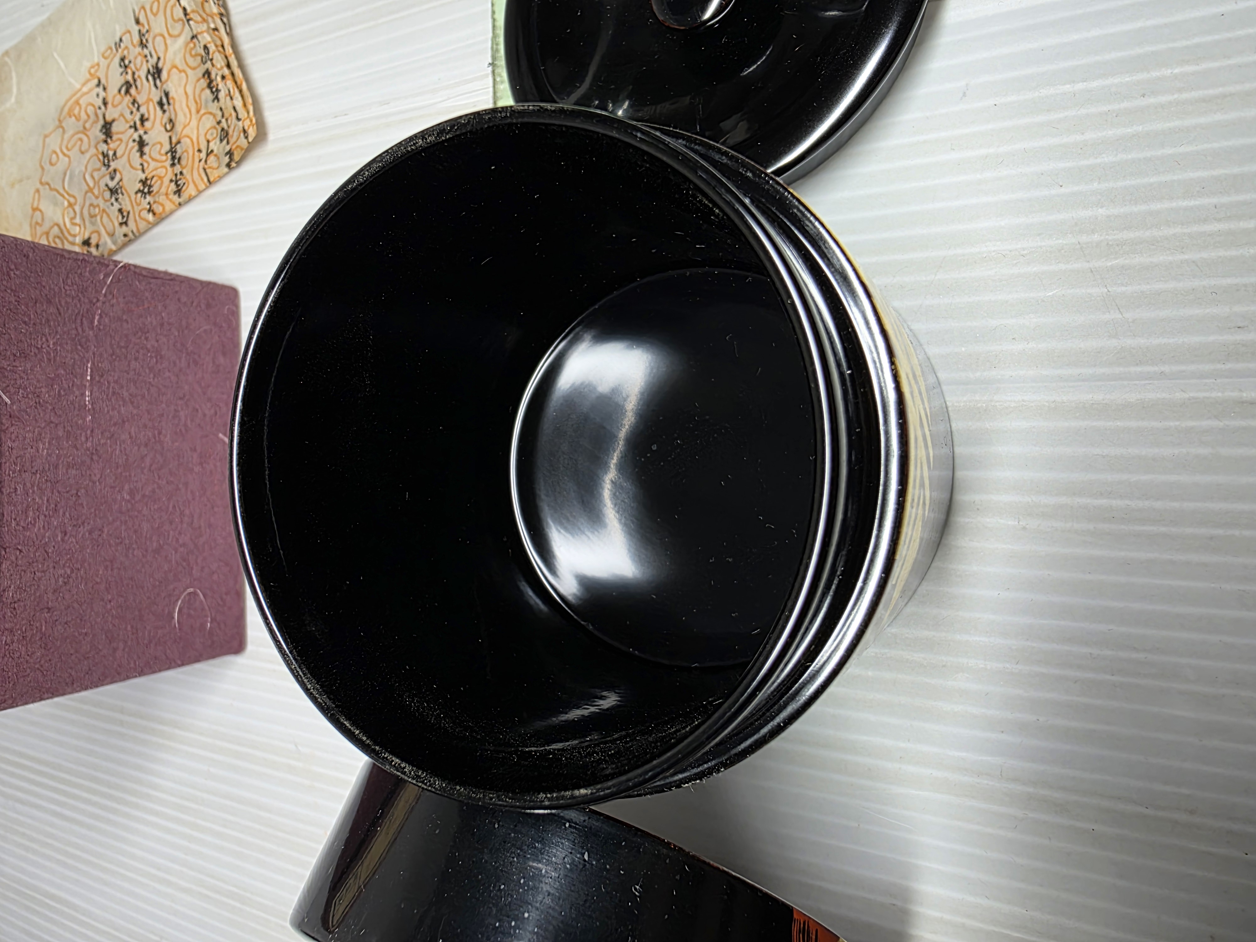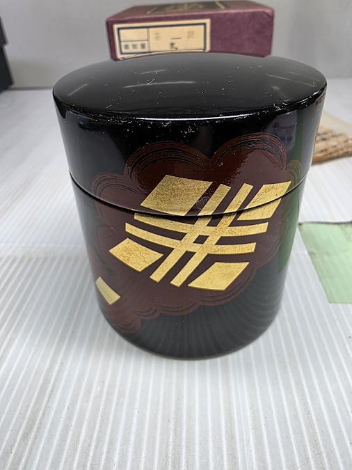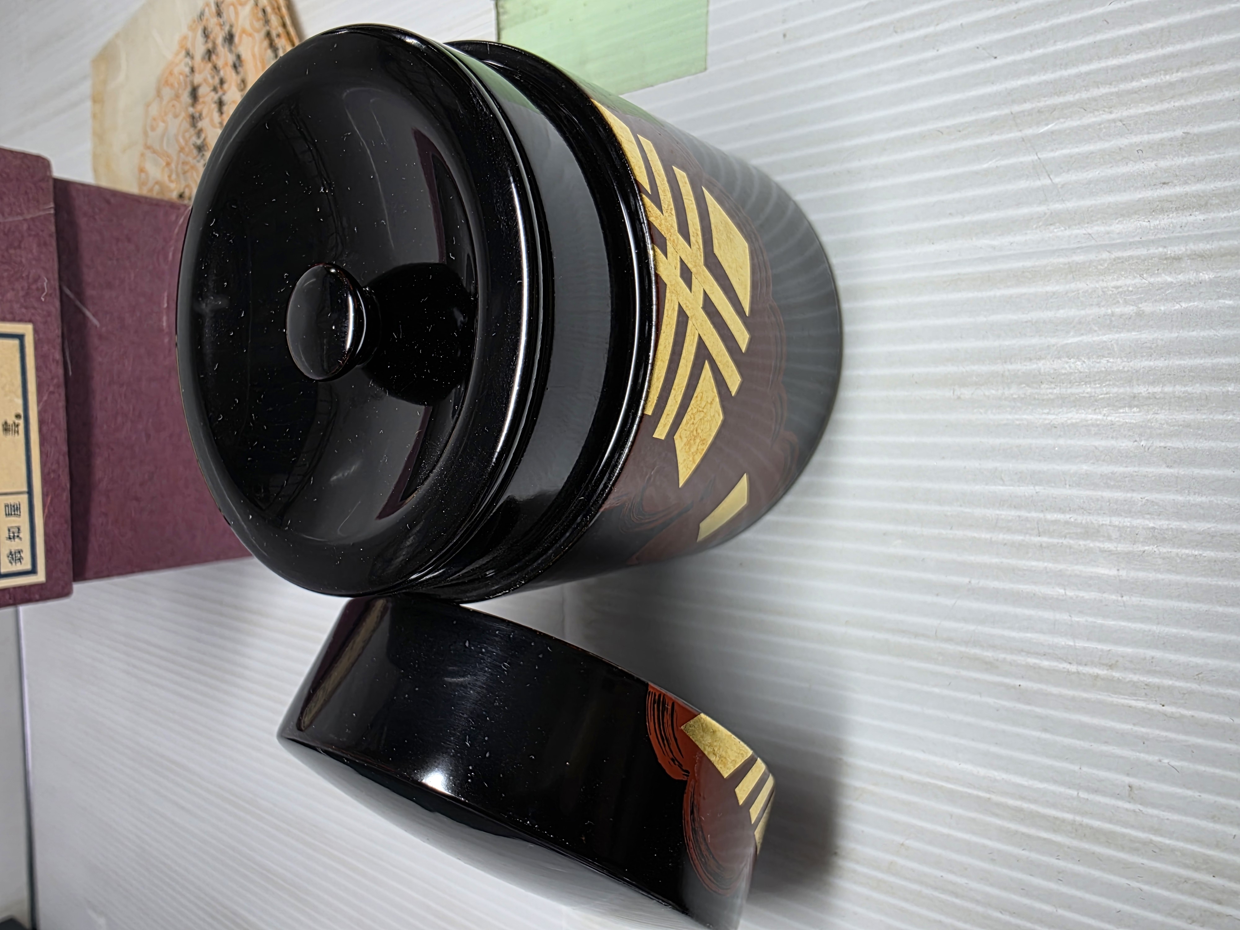 翁知屋の秀衝塗の茶筒、雲です。寸法は8×7 5×7.5cm