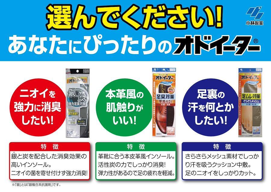 【特徴】 ・銀と炭がダブルに働くからニオイが気にならなくなる。 銀:インソール表面に、ニオイの発生を抑えるといわれる銀を配合。 炭:靴のニオイもしっかり消臭、炭にあいている無数の小さな穴がニオイ成分を吸着。 ・吸汗効果/通気性:クッション部のフォームラバー層が汗を吸収。通気性にも優れ、靴の中はいつもサラサラで快適! ・クッション効果:フォームラバー層はクッション性に優れているため、足と靴をフィットさせるとともに元気な足をサポートします。 【使用方法】 オドイーターはいろいろなサイズ(20.0cm~28.0cm)の靴にご使用いただけます。 (1)インソール裏側のサイズ線に沿って、最初はご自分のサイズより少し大きめに切り取ってから、靴に合わせて調整してください。 (2)必ず黒い面を下にして敷いてください。 ※汚れた場合は、湿った布をかたくしぼってふいてください。 ※使用条件にもよりますが約1ヶ月間使用できます。 ご注意 【使用上の注意】 ・足に異常を感じた場合は、すぐに使用を中止してください。 ・窮屈な靴に使用すると傷みを生じる場合がありますので、出来るだけ大きさに余裕のある靴でお使いください。 ・多汗症の方や、特に汗をかきやすい状況でのご使用は、表面布や靴下の黒ずみの原因になることがあります。 銀と炭の2つの力で、雑菌やカビの繁殖を抑え足のニオイの発生源を抑えるインソール。 原産国 :日本 内容量 :1足分 商品サイズ (幅×奥行×高さ) :113×7×328