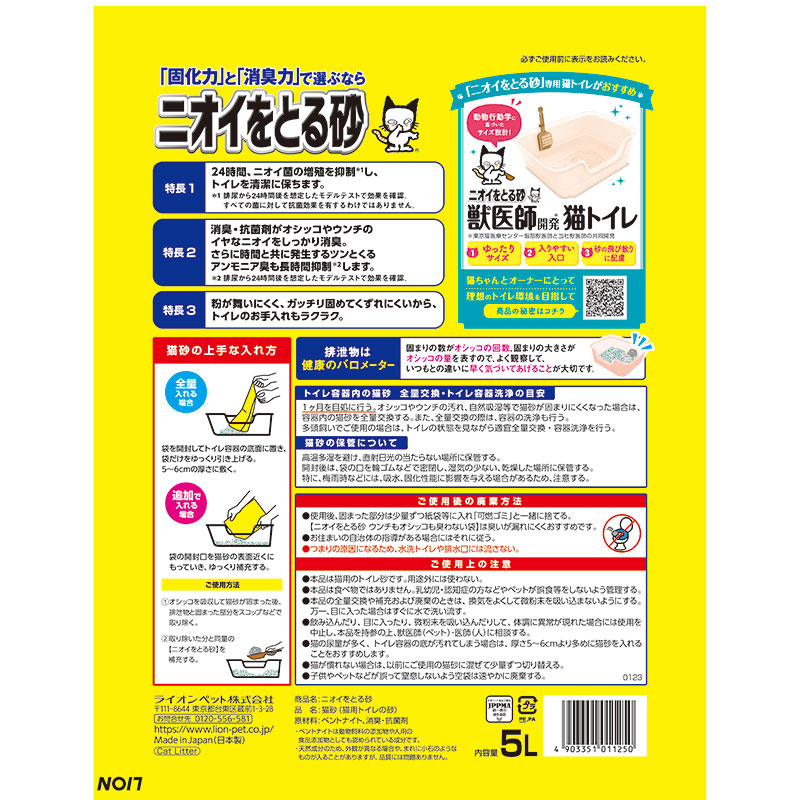 ・24時間、ニオイ菌の増殖を抑制し、トイレを清潔に保ちます。・消臭、抗菌剤がオシッコやウンチのイヤなニオイをしっかり消臭。さらに時間と共に発生するツンとくるアンモニア臭も長時間抑制します。・粉が舞いにくく、ガッチリ固めてくずれにくいから、トイレのお手入れもラクラク