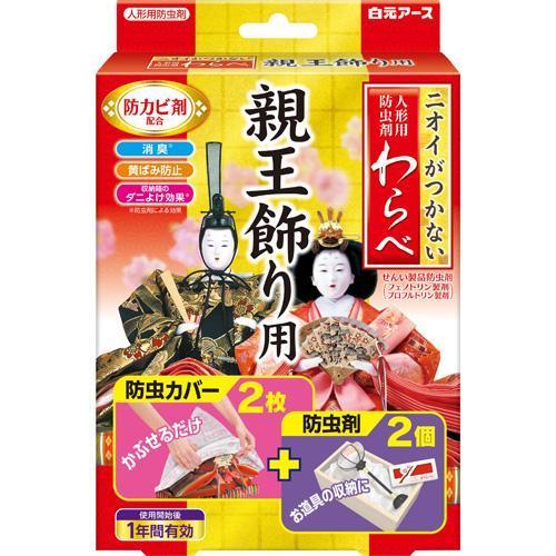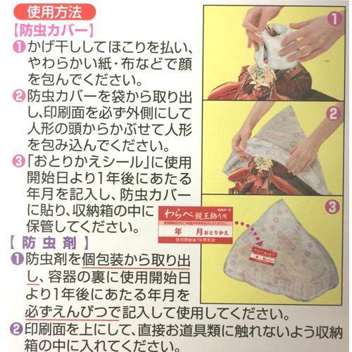 【使用方法】★防虫カバー(1)かげ干ししてほこりを払い、やわらかい紙・布などで顔を包んでください。(2)防虫カバーを袋から取り出し、印刷面を必ず外側にして人形の頭からかぶせて人形を包み込んでください。(3)「おとりかえシール」に使用開始日より1年後にあたる年月を記入し、防虫カバーに貼り、収納箱の中に保管してください。★防虫剤(1)防虫剤を個包装から取り出し、容器の裏に使用開始日より1年後にあたる年月を必ずえんぴつで記して使用してください。(2)印刷面を上にして、直接お道具類に触れないよう収納箱の中に入れてください。