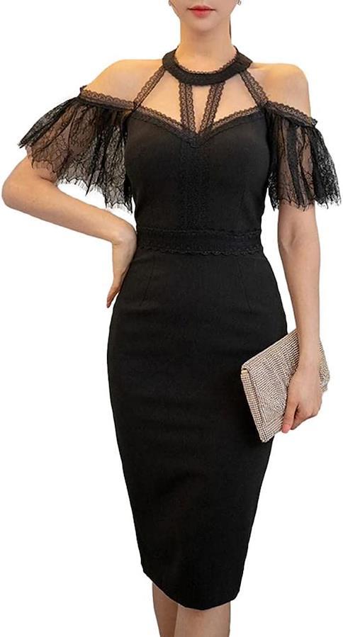 ・首元から肩はレースで品よく肌見え、そして綺麗なボディーラインを見せられるタイトワンピース、パーティードレスです。