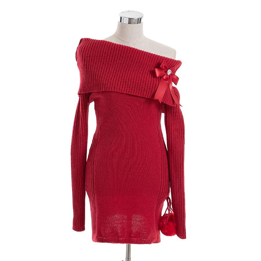 デコルテを美しく見せるオフショルダーデザインで、女性らしい雰囲気を引き立てます。