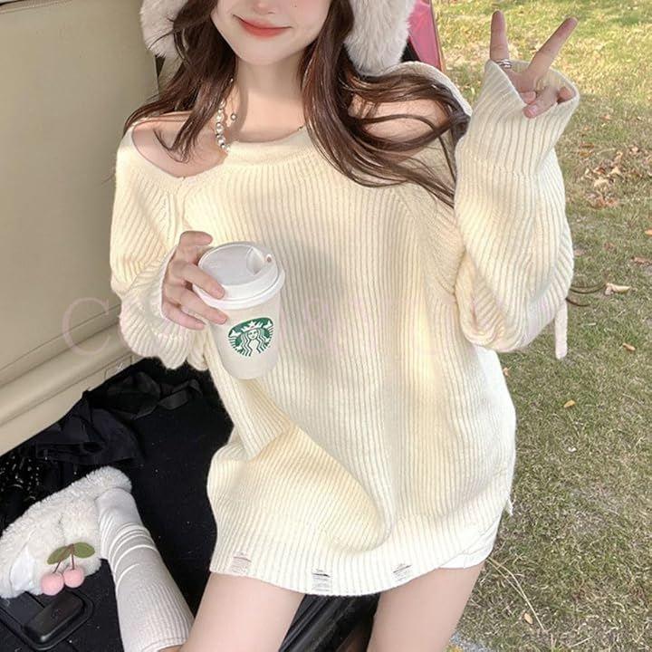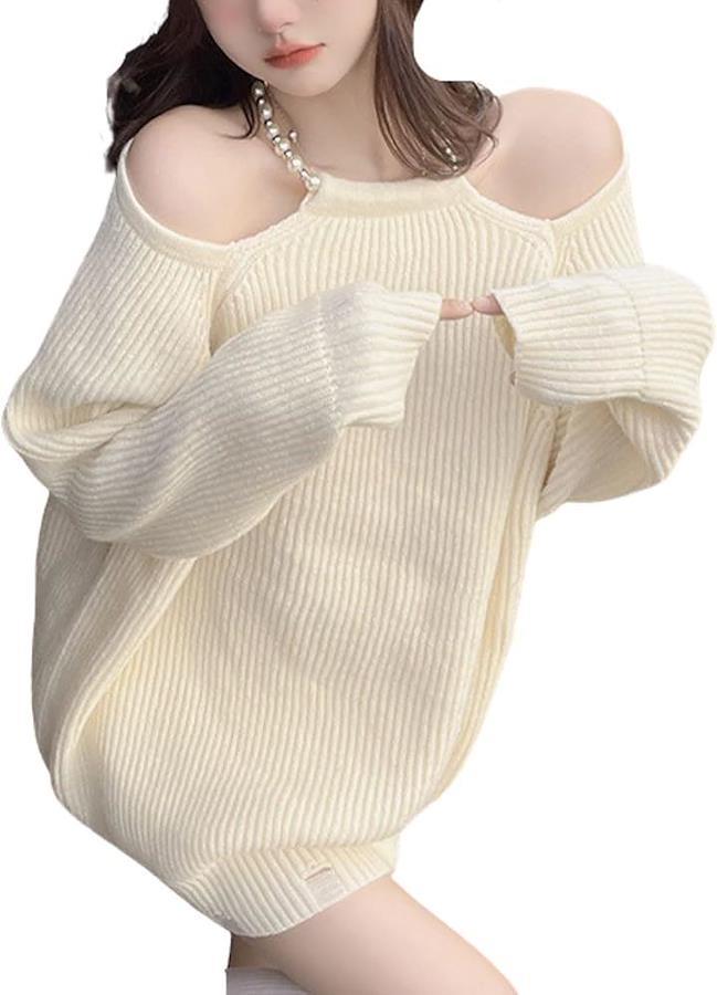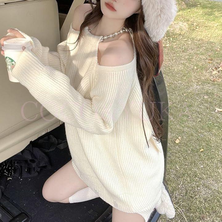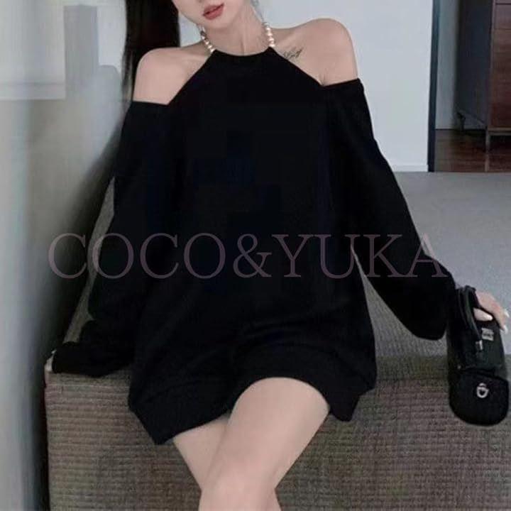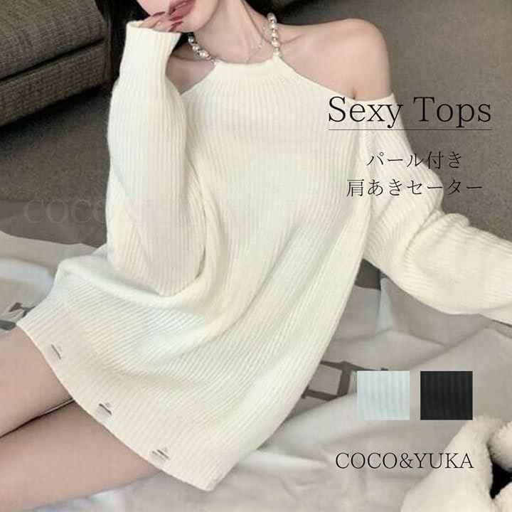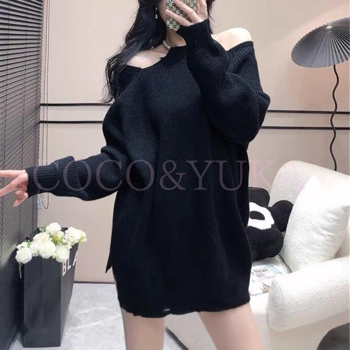 Off-the-shoulder knit sweater/mini dress, long sleeves, loose fit, sexy, tunic, cute, distressed, solid color, women's, with pearl accents