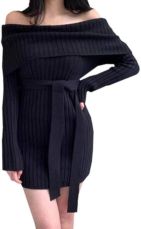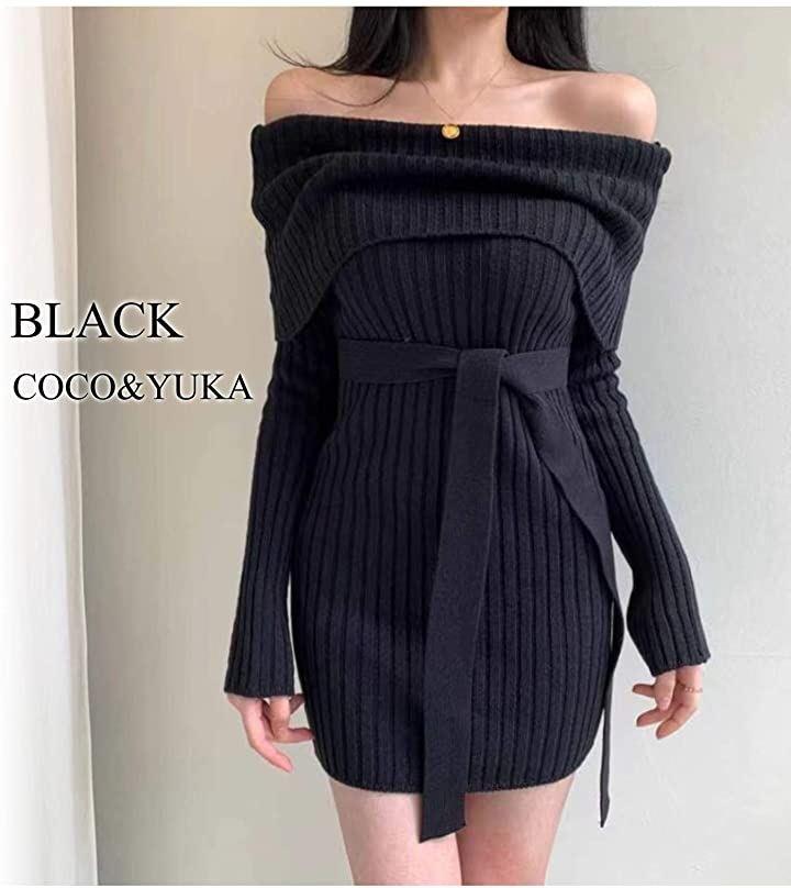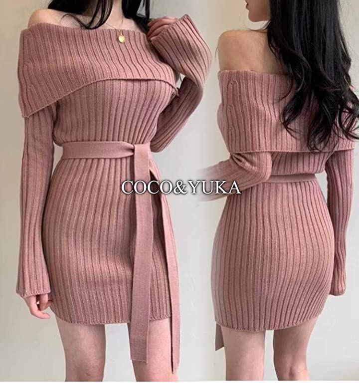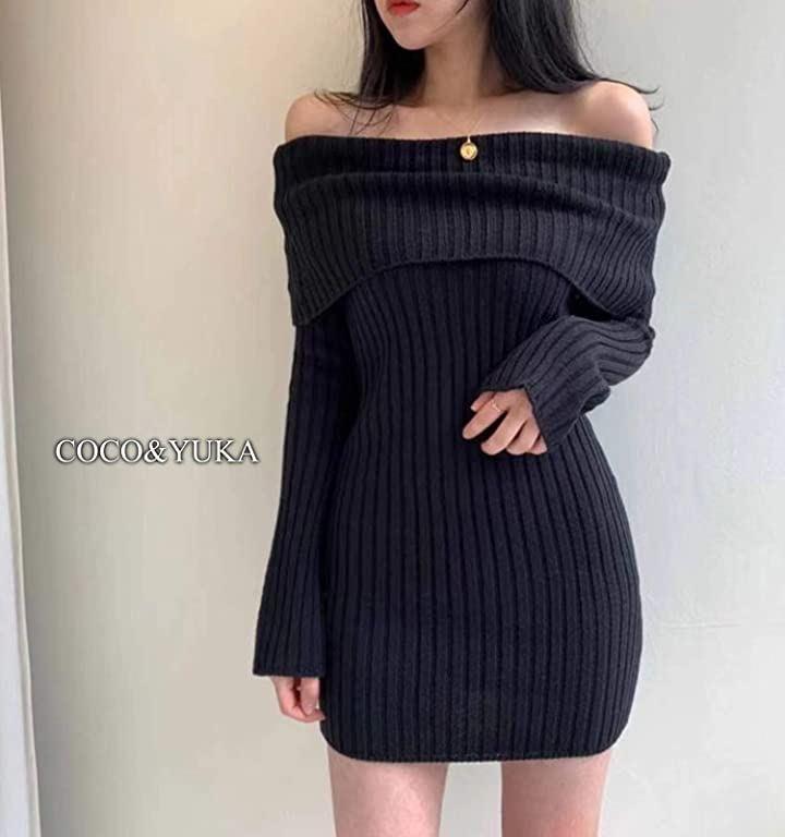 ・肩だし オフショルダー の かわいい タイト ワンピース です・ 長袖 リブニット で 冬 でも あたたかくいられます。