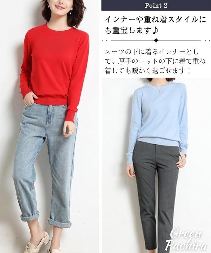 「インナーや重ね着スタイルにも」◉寒い秋や冬は、このクルーネックセーターの上に、さらに厚手のもこもこニットを着ても暖かく快適に過ごせます。