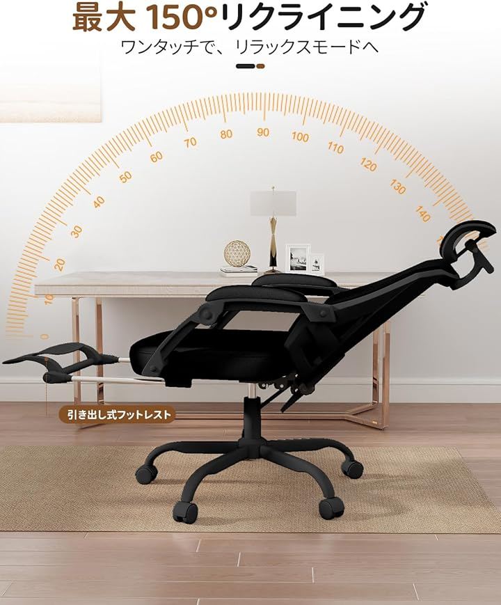 「最大約150°リクライニング&フットレスト付き」背もたれは最大約150°まで調整可能。