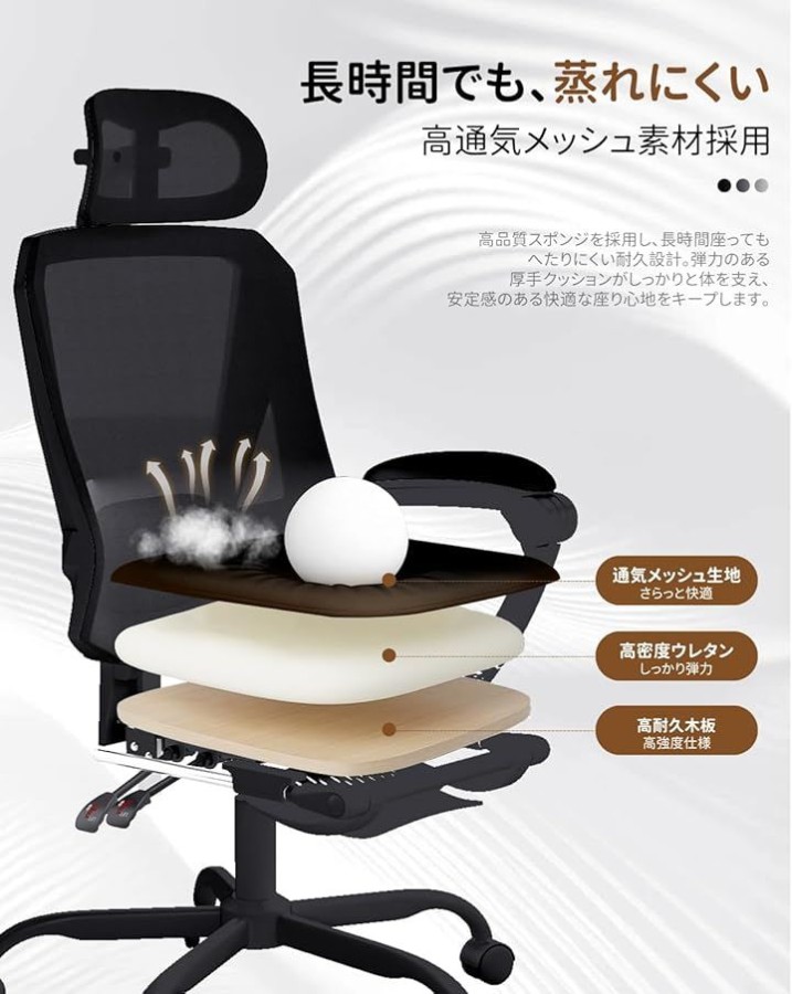 「通気性に優れた快適メッシュ」背面と座面には通気性の高いメッシュ素材を採用。