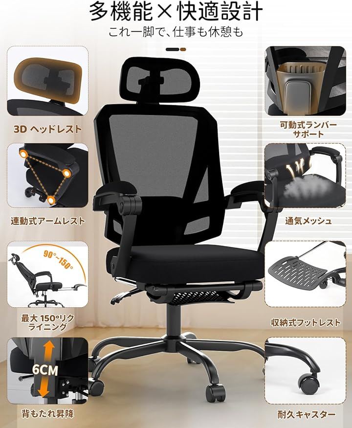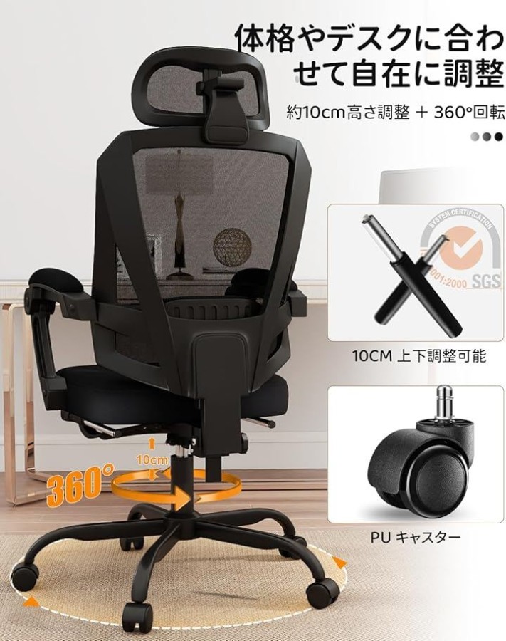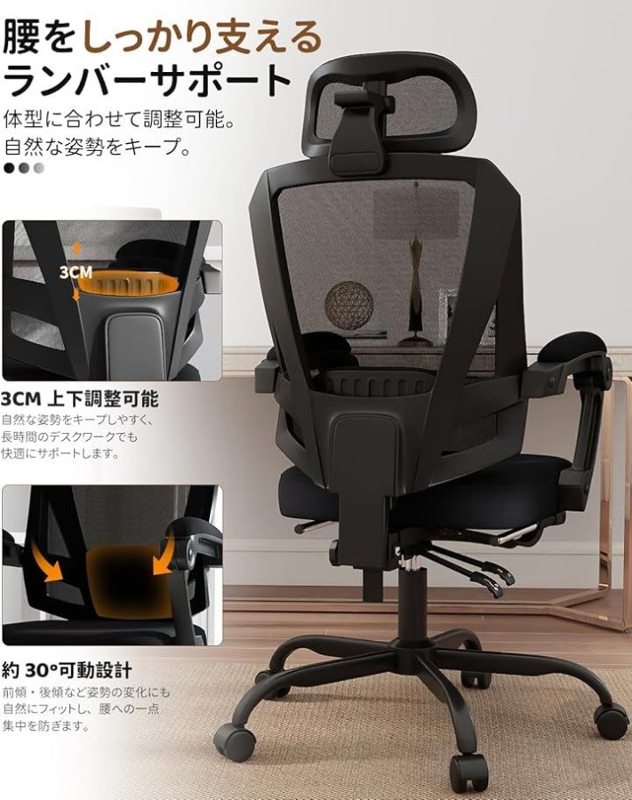 ランバーサポートは上下調整+約30°可動で、体型に合わせてフィットし、長時間のデスクワークによる負担を軽減。