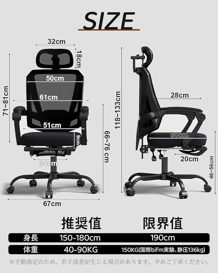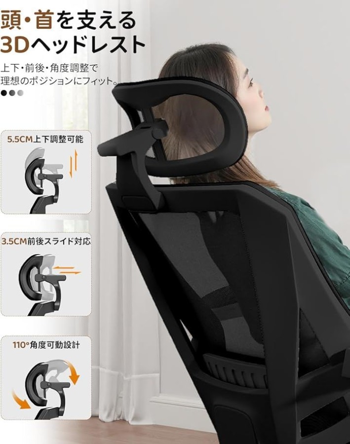 「首・肩・腰を支える立体サポート設計」上下・前後に調整可能な3Dヘッドレストを搭載し、頭部を自然な角度でしっかり支えます。