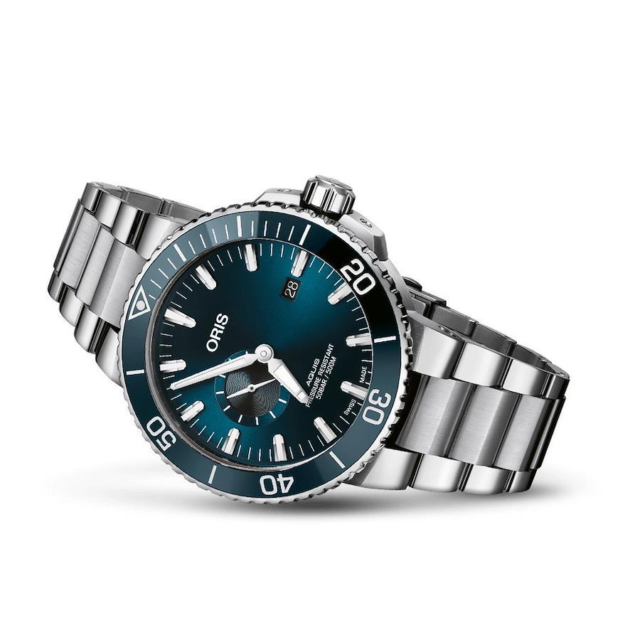 新たな深みへアクイススモールセコンドは、9時位置にスーパールミノバコーティングのスモールセコンドを備えており、薄暗いところでも時計が動いていることを確認出来ます。これはダイバーズウォッチに欠かせない機能です。また、30気圧(300m)防水のアクイスデイトモデル同様ダイバーに安心のねじ込み式リューズ、セラミックインサートの逆回転防止ベゼル、オリスが特許を有するエクステンション機能付きフォールディングクラスプなどに加え、更に50気圧(500m)防水と機能を高めました。