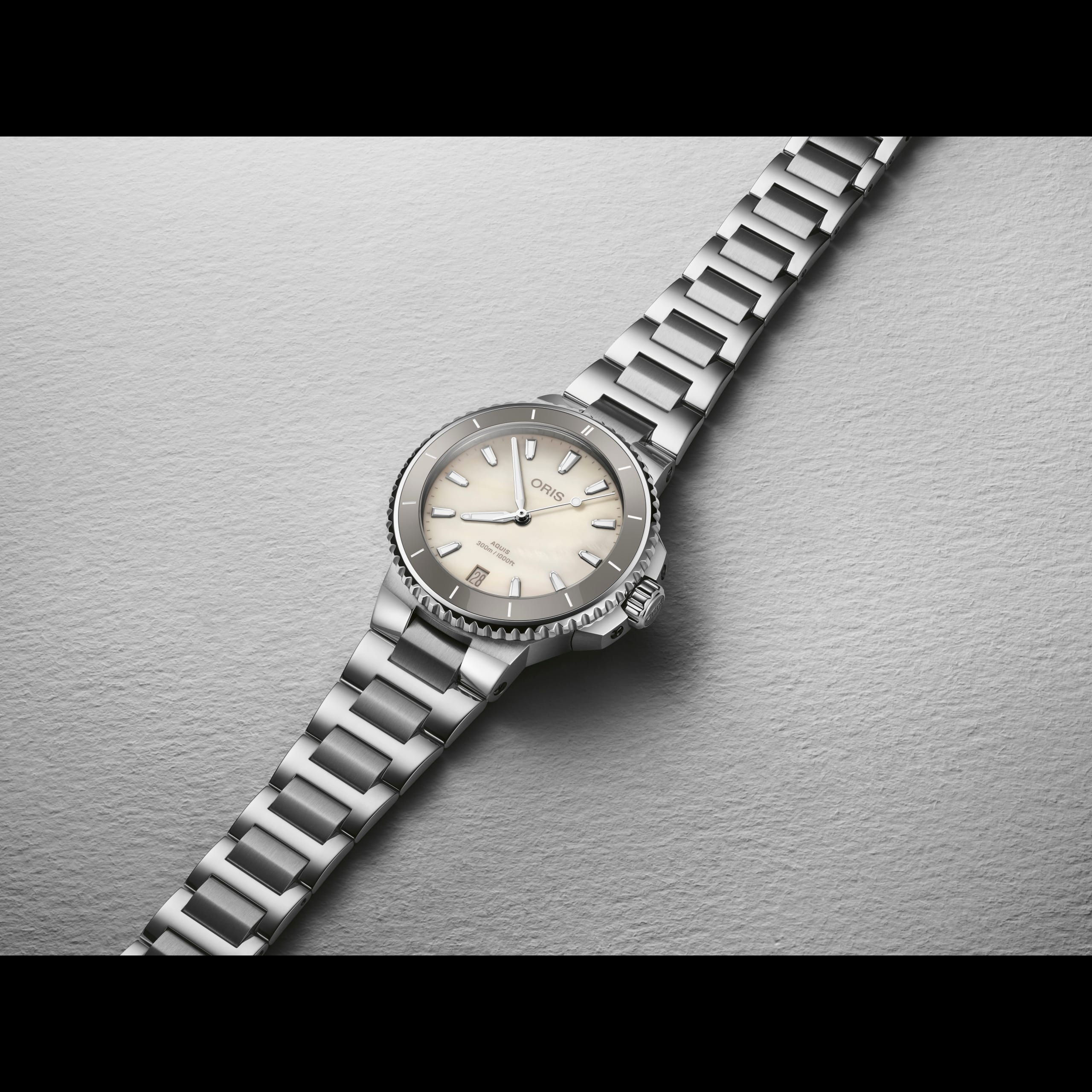 このアクイスデイト36.50mmの文字盤はクリーム色のマザーオブパールで日常使いのツールウォッチにグラマラスなイメージを添えています。スイス製自動巻ムーブメントを防水機能を備えたケースにセットしました。The Seas of Time ダイバーの意見や広範囲に及ぶ研究の結果、誕生したアクイスは、高い機能性だけでなく、デザインにおいても妥協のないダイバーズ。タウンユースでも、ダイビングでも快適な使用感で活躍してくれます。