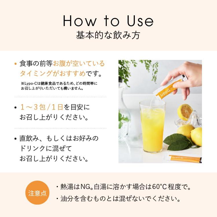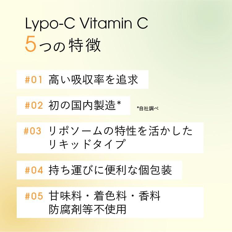 【Lypo-C公式ショップからの販売ですのでご安心下さい】商品管理コードにて製品管理を行っており、 フレッシュな製品をお客様のお手元に届くようしっかりと管理しておりますので、ご安心下さい。 <吸収力にこだわったビタミンCサプリメント>当製品は、吸収率にこだわった国内製造のリポソーム化されたビタミンC(液状)です。 ・ビタミンCは吸収されにくく、体外に排出されてしまう特質があります。ビタミンCをリポソーム化することで、体内利用効率を高めることを目指して開発しました。 <日本初の国産リポソームビタミンC> 長年の研究を重ね独自の製造基準で作った高品質なビタミンC。医療現場でも使用できる基準を厳しく設定して作りました。 <個包装で、持ち運びにも便利なパッケージ> 飲みたい時にすぐに1包で1000㎎のビタミンCが摂取できます。 <サラサラの液状> Lypo-Cは、サッと水に拡散するほど微細なリポソームなので、良い状態を維持しながら速やかに吸収される性質です。