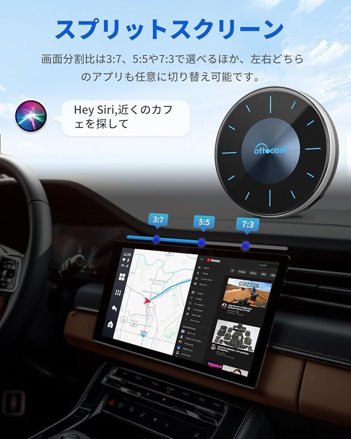 「豊富なアプリ対応&スプリットスクリーン機能」 Ottocast OttoAibox P3なら、HDMI入力がない車でも人気アプリが使用可能。