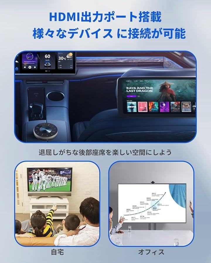 いつものCarPlayポートに接続するだけで、車内エンタメ環境が一気に進化。スプリットスクリーン機能も搭載しており、ナビゲーション中でも動画視聴を同時に楽しめます。