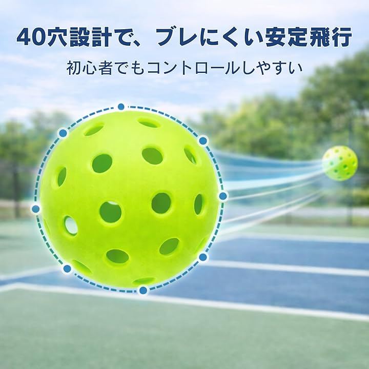 「練習に適した40穴設計で安定した飛行性能」ピックルボール特有の空力特性を考慮した40穴設計を採用。