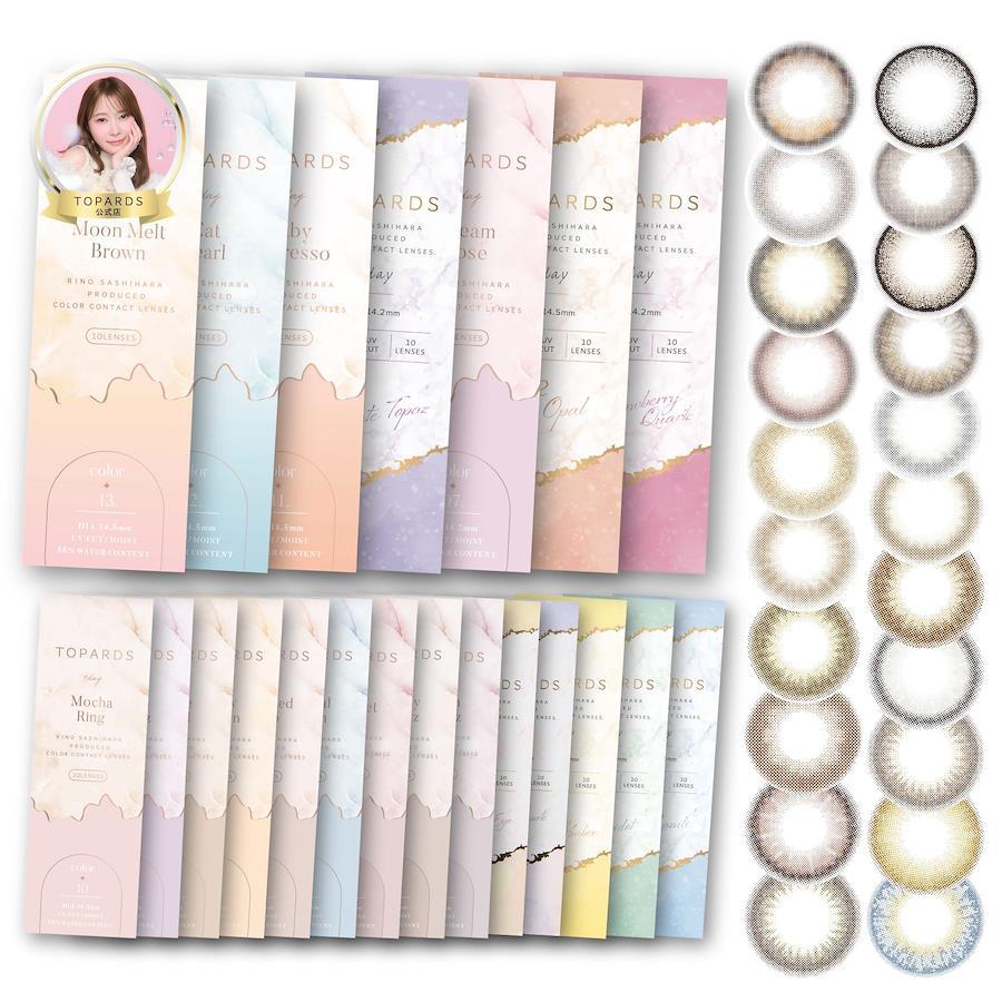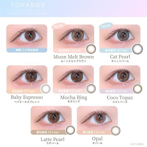 Always with me『バレバレは嫌。けれど変わったって感じたい』TOPARDSはそんなわがままに応えるために生まれました。わざとらしくない大人盛れを実現する瞳にツヤを出す透明感カラーとウルっとした瞳に魅せる繊細デザイン。シーンによって使い分けできるレンズをそろえ、どんな場面でも自然でかわいいあなたを演出します。 指原莉乃イメージモデルカラコン「TOPARDS(トパーズ)」月にとろける瞳の魔法?うるっときらめく美人盛れレンズ新登場! [含水率55% 高含水・イオン性レンズ]水分を多く含むやわらかい素材で、瞳に違和感なく快適なつけ心地です。※装用感には個人差があります。脂質汚れが付きにくく、水分を多く含み酸素を通しやすいため瞳への負担が少なく、快適な装用感です。※ムーンメルトブラウン・キャットパールのみ [含水率38% 低含水・非イオン性レンズ]低含水レンズはレンズ自体に必要な水分が少ないため長時間の装用やドライアイ気味の方にもおすすめです。汚れがつきにくく長時間の装用でも視界をクリアに保ち、快適さが持続します。 [うるおい成分MPCポリマー配合]ヒアルロン酸約2倍の保水力で、朝から夜まで1日中快適な着け心地に?※TOPARDS1dayシリーズにはMPCポリマーが配合されていないカラーもございます。ご了承ください。 [UVカット]肌や瞳に有害といわれ、白内障などの眼病を引き起こす危険性のある紫外線※をカットします。※UV-A波50%以上、UV-B波95%以上カット [サンドイッチ構造]色素が直接瞳とまぶたに触れることがないレンズ構造を採用しています。 [レンズ形状]フチを丸みのある形状にすることで自然な装用感を実現しました。 (#lf)(#lf)(#lf)商品購入前に、ストア紹介ページをご確認ください。