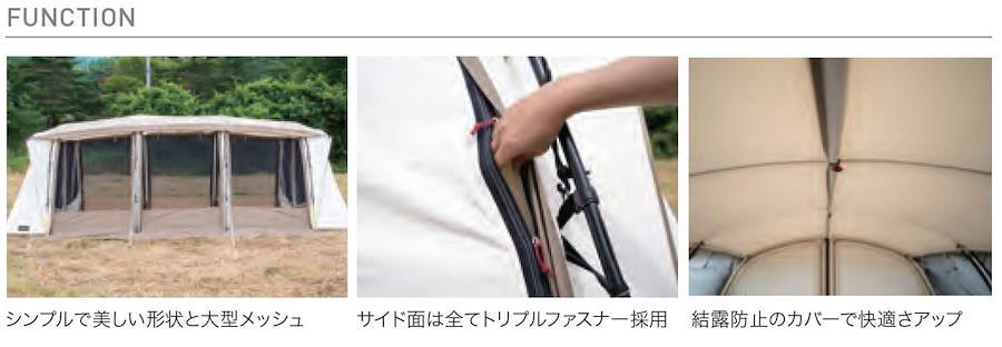 T/C素材のアポロン。大人気の「アポロン」がT/C素材になって快適性が格段にアップ。全開放可能なメッシュパネルで解放感抜群。ルーフフライ標準装備で遮光性・結露対策も万全。サイド面は全てトリプルファスナー採用です。