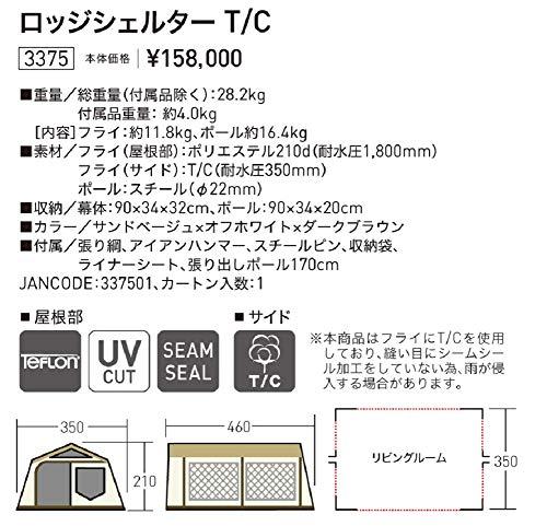 素材:フライ(屋根部)/ポリエステル210d(耐水圧1800mm)、フライ(サイド)/TC(耐水圧350mm)素材:ポール/スチール径27mmサイズ:460cm×350cm×高さ210cm収納サイズ:幕体/90×34×32cm、ポール/90×34×30cm重量(付属品除く):28.2kg[内容]フライ/約11.8kg、ポール/約16.4kgカラー:サンドベージュ×オフホワイト×ダークブラウン付属品:張り綱、アイアンハンマー、スチールピン、収納袋、ライナーシート、張り出しポール(170cm)×2収納人数:5人原産国:中国