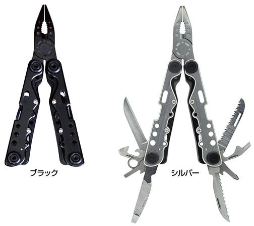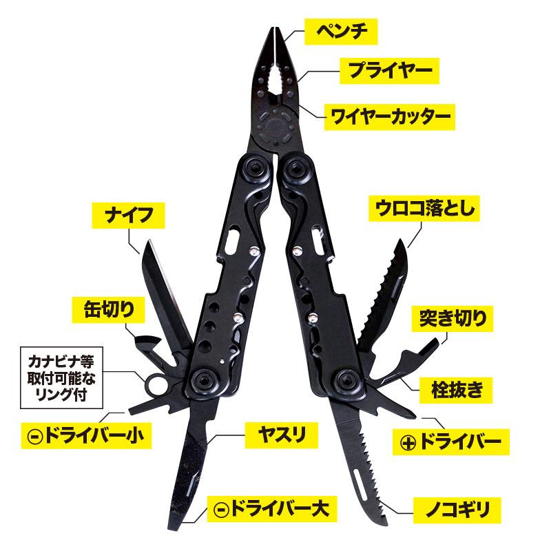 13ツールのステンレスプライヤー。これ1本でプライヤー、ペンチ、ワイヤーカッター、ナイフ、ウロコ落とし、缶切り、プラスドライバー、マイナスドライバー(小)、マイナスドライバー(大)、ヤスリ、ノコギリ、突き切り、栓抜きの13ツール。カラビナなどが取り付け可能なリングも付属。収納時はおりたたんで収納可能。釣り、キャンプ、アウトドアなどであると便利なツールを詰め込んだ多機能プライヤー。