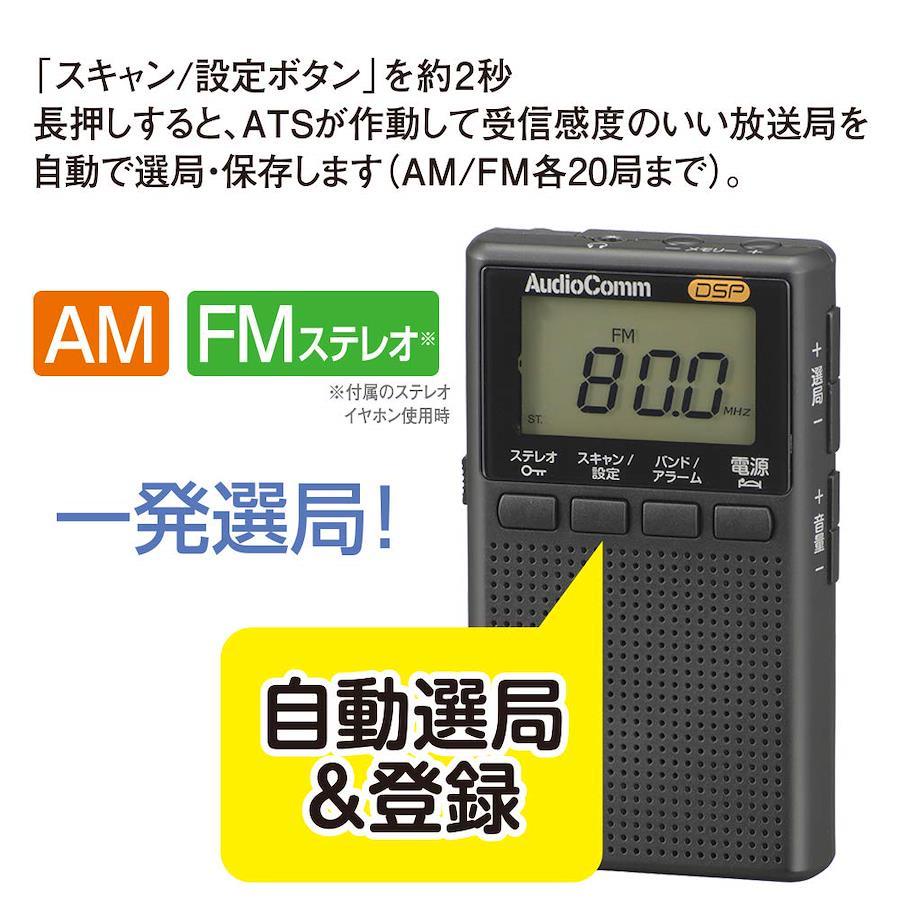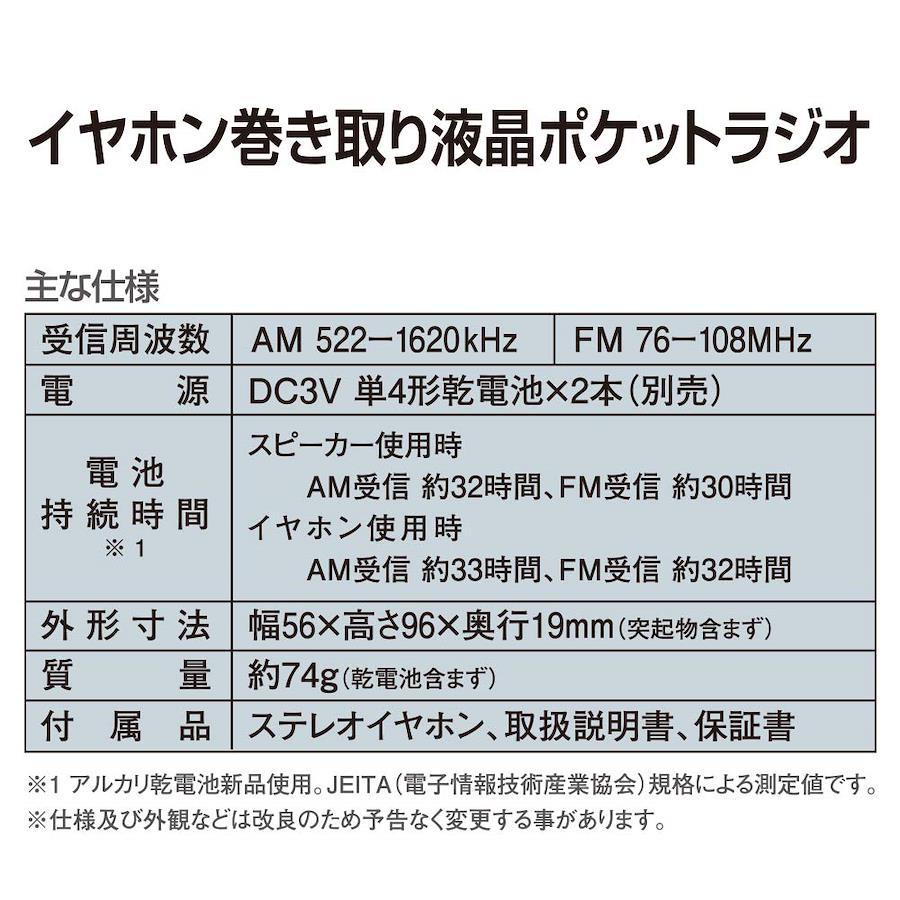 【 仕 様 】■ 受信周波数:AM…522~1620kHz、FM…76~108MHz■ 電源:DC3V 単4形乾電池×2本(別売)■ 乾電池持続時間:※ アルカリ乾電池新品使用。JEITA(電子情報技術産業協会)規格による測定値です。・スピーカー使用時…AM受信 約32時間、FM受信 約30時間・イヤホン使用時…AM受信 約33時間、FM受信 約32時間■ 外形寸法:幅56×高さ96×奥行19mm(突起物含まず)■ 質量:約74g(乾電池含まず)■ 付属品:ステレオイヤホン、取扱説明書、保証書