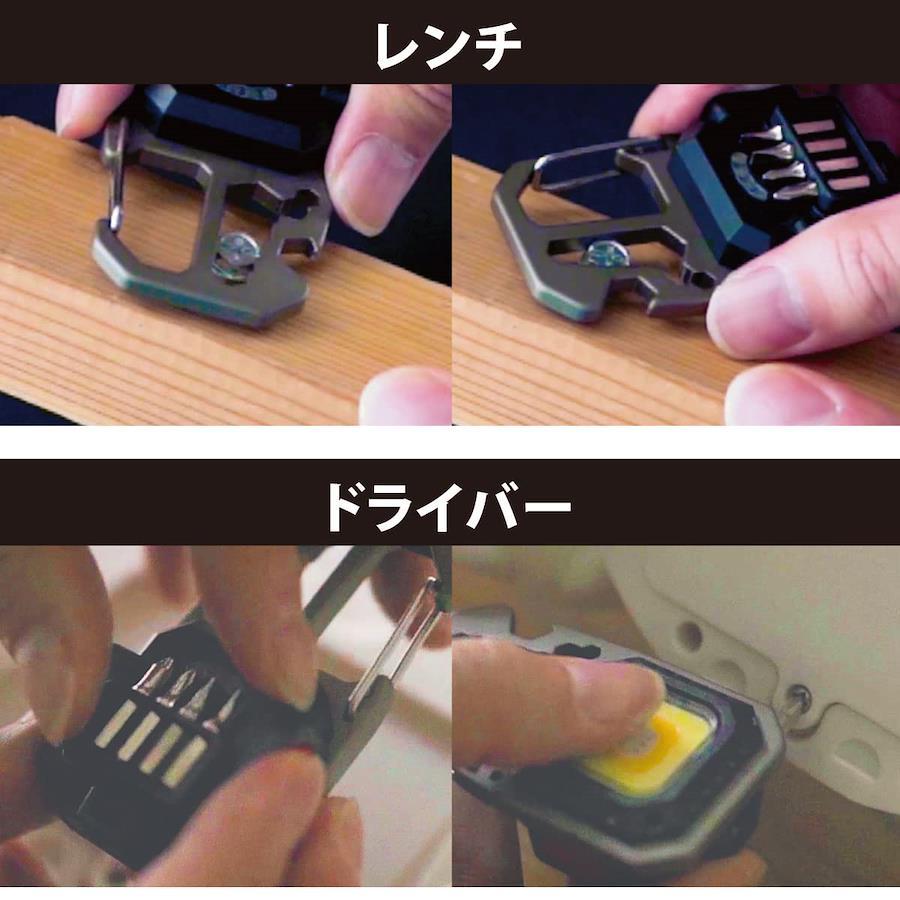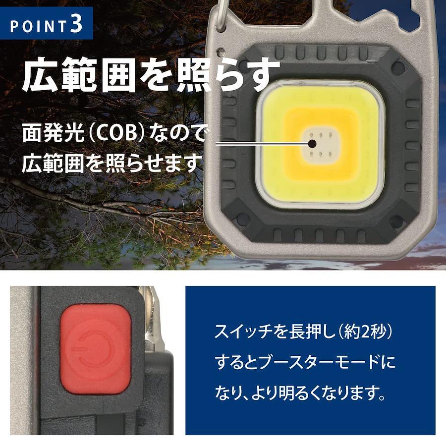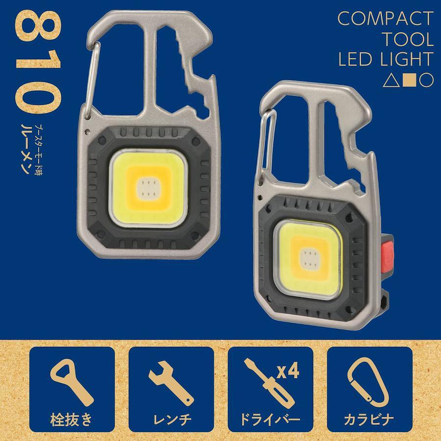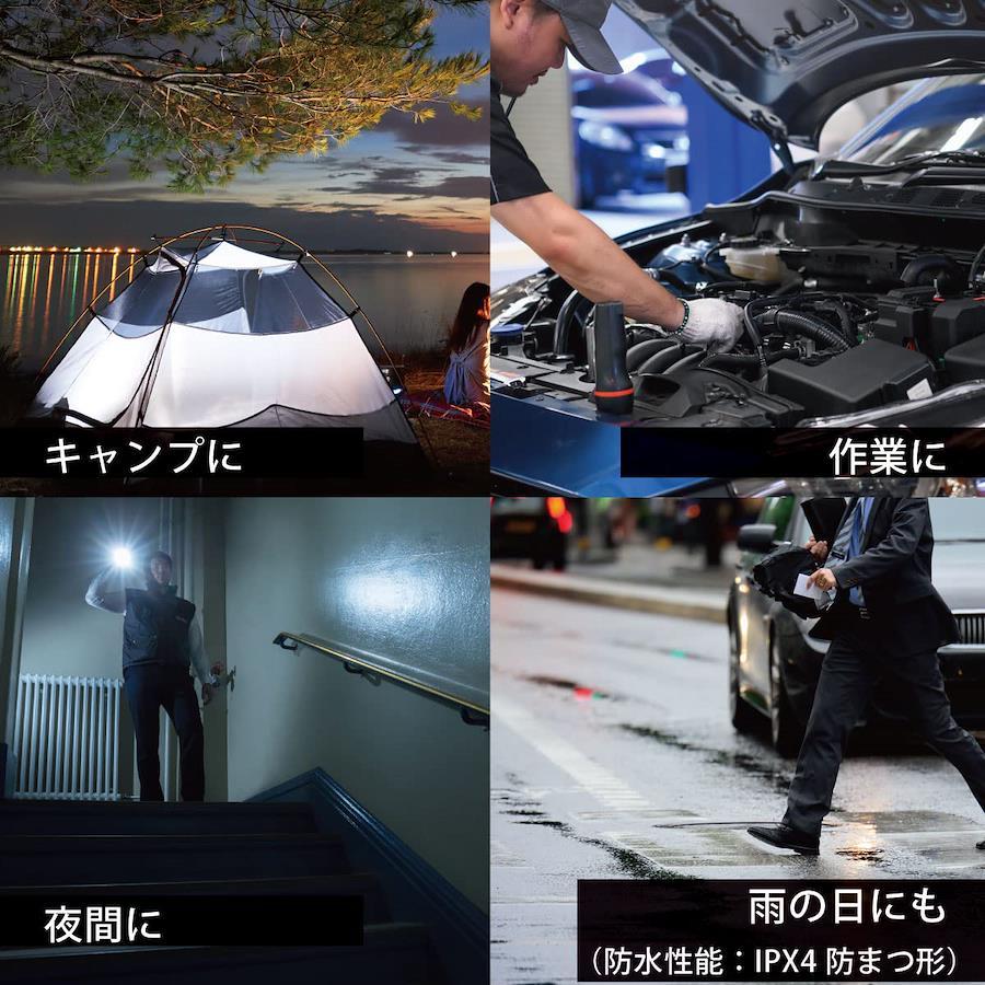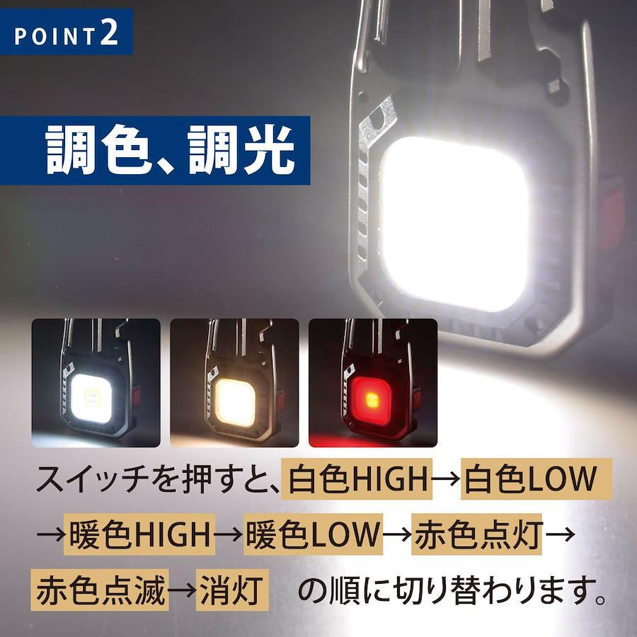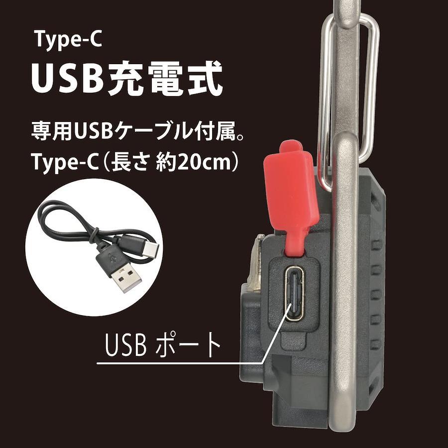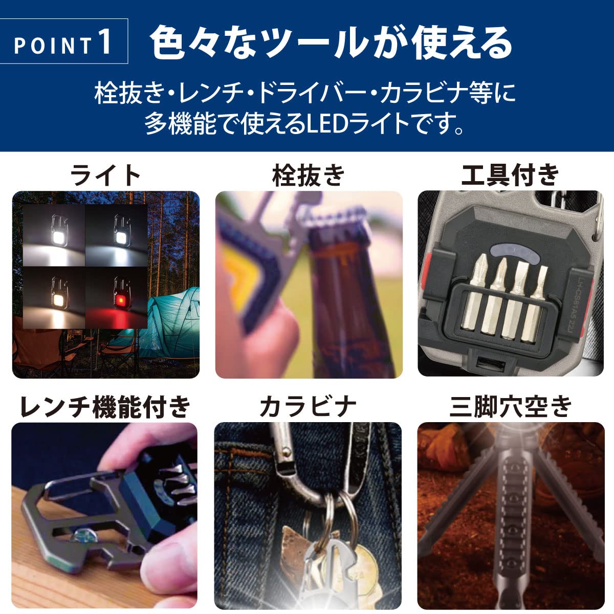 【 仕 様 】■ 電源:リチウムイオンバッテリー(3.7V 500mAh内蔵)※交換不可■ 光源:LED(交換不可)■ 定格入力:DC5V 0.65A(最大)■ 充電時間:約1時間(満充電まで)※充放電 約500回可能■ 保護等級:防水性能:IPX4(防まつ形)…あらゆる方向からの飛まつによる有害な影響がない保護レベル ※JIS C 0920:2003による■ 本体質量:約47g■ 外形寸法:(約)幅45×高さ78×奥行24mm■ 付属品:充電用USBケーブル Type-C(長さ 約20cm)■ 光束及び連続使用時間 ※満充電時・ ブースターモード(白色+暖色)…約810ルーメン、約0.7時間・ HIGHモード(白色)…約600ルーメン、約1時間・ HIGHモード(暖色)…約500ルーメン、約1時間・ LOWモード(白色)…約250ルーメン、約2時間・ LOWモード(暖色)…約210ルーメン、約2時間【 特 長 】 ◆アウトドアに便利、明るく軽量コンパクトな多機能ライト ◆栓抜き/レンチ/ドライバー(4種)ツール、カラビナ付き◆三脚(別売:メーカー型番SL-PCTA5)に取り付けてハンズフリー使用もできます ◆調色(白色/暖色)、調光(HIGH/LOW)、赤色点灯、赤色点滅機能付き ◆ブースターモードで明るさパワーアップ(約810ルーメン) ◆面発光(COB)なので広範囲を照らせます ◆USB充電式(専用USBケーブル付属) ◆充電残量表示機能付き【 仕 様 】 ◆電源:リチウムイオンバッテリー(3.7V 500mAh内蔵)※交換不可 ◆光源:LED(交換不可) ◆定格入力:DC5V 0.65A(最大) ◆充電時間:約1時間(満充電まで)※充放電 約500回可能 ◆保護等級:防水性能:IPX4(防まつ形)…あらゆる方向からの飛まつによる有害な影響がない保護レベル ※JIS C 0920:2003による ◆本体質量:約47g ◆外形寸法:(約)幅45×高さ78×奥行24mm ◆付属品:充電用USBケーブル Type-C(長さ 約20cm) ◆光束及び連続使用時間 ※満充電時・ ブースターモード(白色+暖色)…約810ルーメン、約0.7時間・ HIGHモード(白色)…約600ルーメン、約1時間・ HIGHモード(暖色)…約500ルーメン、約1時間・ LOWモード(白色)…約250ルーメン、約2時間・ LOWモード(暖色)…約210ルーメン、約2時間