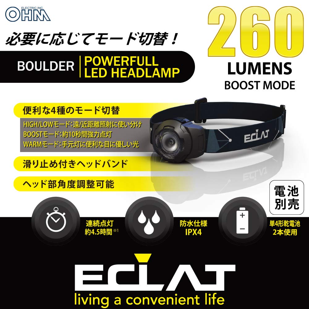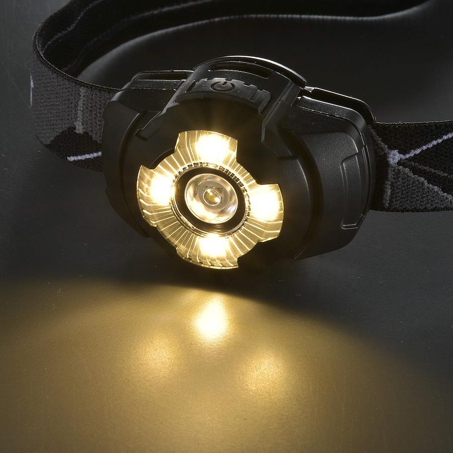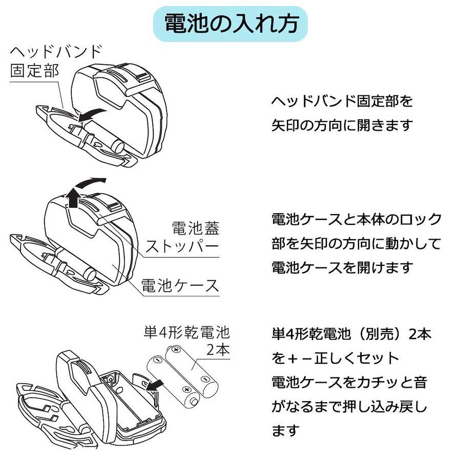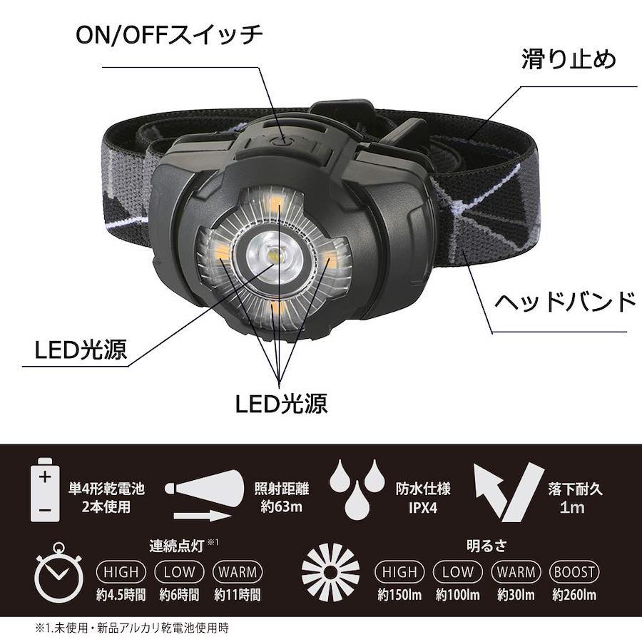 ●便利な4種のモード切替(HIGH/LOW/WARM/BOOST) ●HIGH/LOWモード:遠/近距離照射に使い分け ●WARMモード:手元灯に便利な目に優しい光 ●BOOSTモード:約10秒間強力点灯 ●滑り止め付きヘッドバンド ●ヘッド部(最大約50°)角度調整可能 ●単4形乾電池2本使用 ●照射距離は約63m ●防水仕様(IPX4) ●落下耐久 1m電源:単4形乾電池2本(別売)光源:白色系LED1個(LED交換不可)、暖色系LED4灯(LED交換不可)光束:点灯HIGHモード約150 lm・点灯LOWモード約100 lm・点灯WARMモード約30 lm・点灯BOOSTモード約260 lm連続使用時間:点灯HIGHモード約4.5時間・点灯LOWモード約6時間・点灯WARMモード約11時間照射距離:約63m