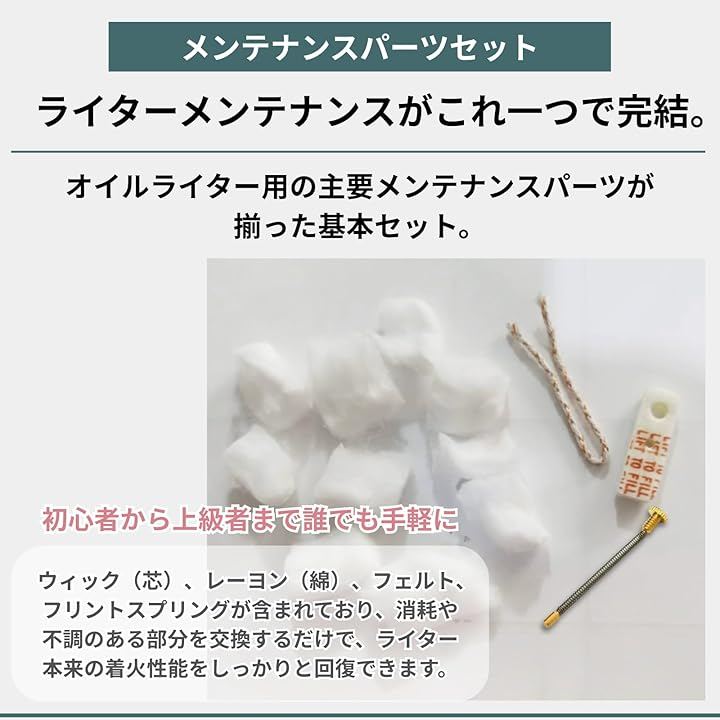 ウィック(芯)、レーヨン(綿)、フェルト、フリントスプリングが含まれており、消耗や不調のある部分を交換するだけで、ライター本来の着火性能をしっかりと回復できます。