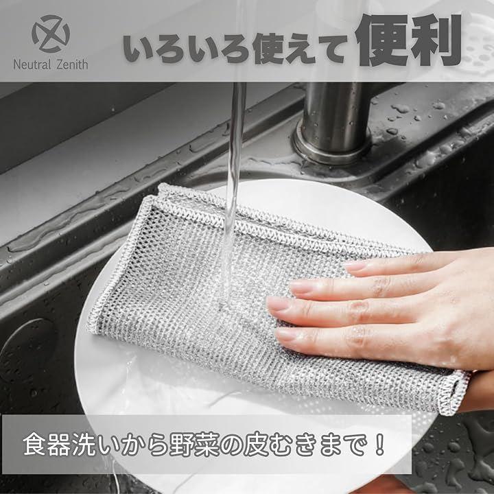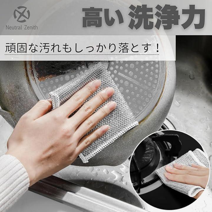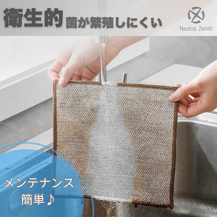「高い洗浄力の金属ワイヤーふきん」金属ワイヤーの繊維が頑固な汚れや油脂をしっかりと落とすため、キッチンの掃除や食器洗いに非常に効果的です。