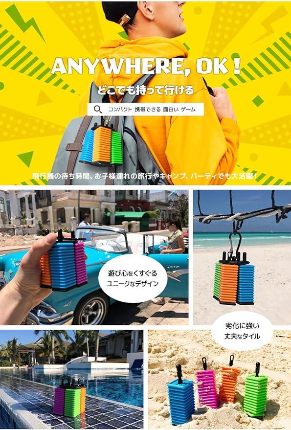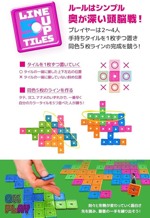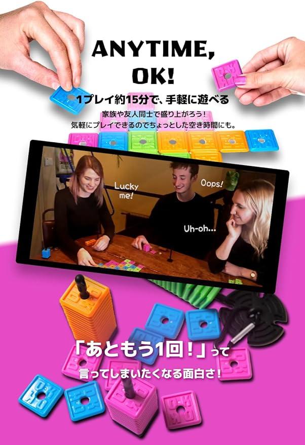 この商品について 【 イギリス発の5目並べゲーム 】 シンプルなルールですぐに遊べる!思考力と戦略性を楽しめるファミリーボードゲーム。2018年ベストファミリーゲーム賞、2018年ペアレンツチョイスアワード受賞 2人-4人でプレイ 1プレイ:10分~15分程度 6歳以上 【 10秒でわかる!かんたんルール 】 タテ、ヨコ、ナナメのいずれかで5つのタイルを最初に並べたら勝利! 6歳~小学生から大人の方まで一緒に楽します。かんたんルールで戦略性が楽しめて、ボードゲーム初心者の方や子どもでもゲームに勝つことができます! 【 心理戦や戦略性を楽しめる 】 攻める?それとも相手のブロックする?誰かがリーチすると他プレイヤーと協力してブロックする「心理戦」の駆け引きも面白い! 他プレイヤーの思考を読み取ってゲームに勝利しよう!ゲーム後半はさらに戦略性がUP!! 【 コンパクトで持ち運びがカンタン 】 クリップ付きでバッグにつけたり、ハッグの中にかんたんに収納できます。 自宅、ホテル、電車、飛行機の中、パーティ、公園、キャンプなどあらゆるシチュエーションにぴったり。 1プレイ15分程度で友だちや家族と気軽にゲームを楽しめます。 【 遊び心をくすぐるユニークなデザイン 】 高品質プラスチックタイルを使用し、耐久性や耐久性にも優れています。タイルは水洗いできるので衛生面でも安心です。 セット内容:タイル60個(4カラー各15個)、ホルダー、カラビナもっと見る
