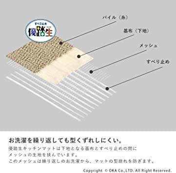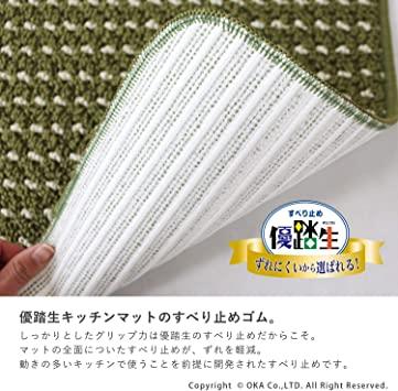毛羽が出る、ほつれる、乾きにくいといった欠点を改良した洗濯機で丸洗いできる日本製キッチンマット「優踏生(ゆうとうせい)洗いやすい」。汚れが落ちやすく洗濯後の乾きも早い使いやすいキッチンマットです。優踏生シリーズで好評の、裏ゴムは当社従来品比5倍もの耐久性。 裏面はすべり止め加工を施しているのでよく動きまわるキッチンでも安心してお使いいただけます。毎日使うキッチンでの汚れ、ケチャップやソースなどの汚れが付いてしまってもお洗濯するとシミも残りにくく清潔に長くご使用頂ける魅力も。またクッション性も十分にありますが薄手なのでシステムキッチンの引き出しに引っかかりにくく毛羽立ちが少ないので日頃のお手入れも簡単です。キッチンだけでなはく玄関や廊下でも足元への負担や冷えを和らげます。