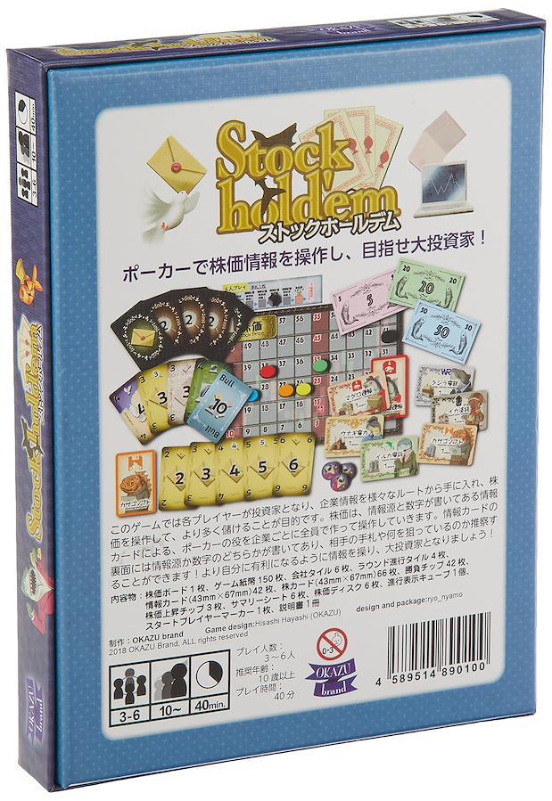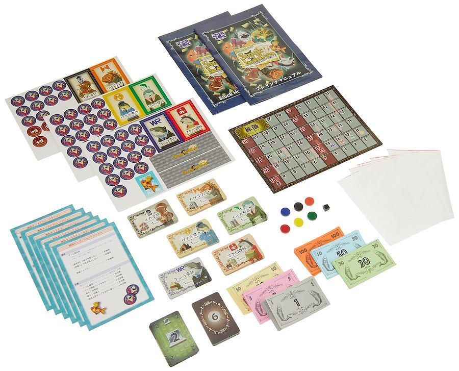 [セット内容]株価ボード1枚、お金150枚、情報カード42枚、株カード66枚、会社タイル6枚、ラウンド進行タイル4枚、勝負チップ42枚、株価上昇チップ3枚、サマリーシート6枚、株価ディスク6枚、進行表示キューブ1個、スタートプレイヤーマーカー1個、マニュアル1冊