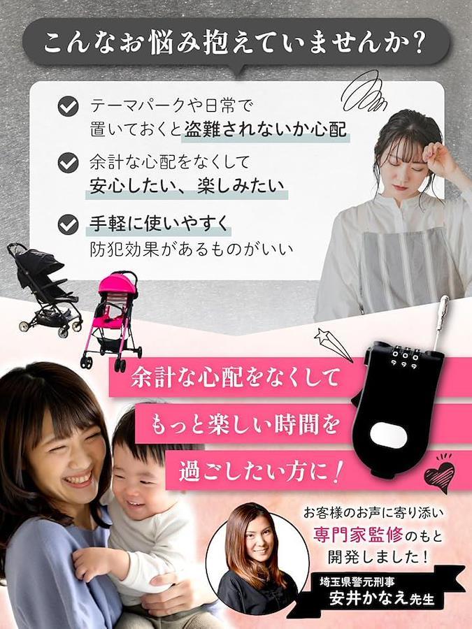 「お悩みを解決。」「テーマパークや日常で、ベビーカーを置いておくと盗難されないか心配。